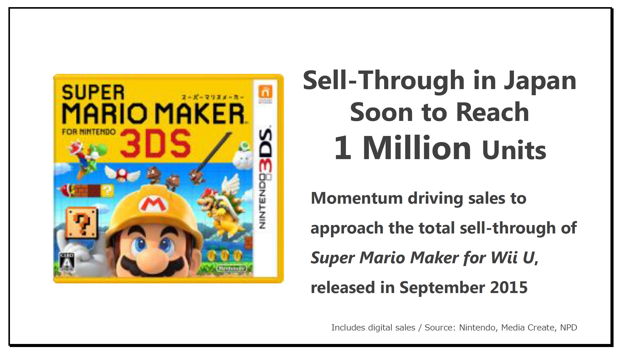 Super Mario Maker for Nintendo 3DS, released in December last year in Japan, continues to sell well and is expected to become a million seller soon. In Japan, this title has the momentum to close in on the total sell-through for Wii U version, which launched the previous year. We were able to reach consumers who own a Nintendo 3DS system, but