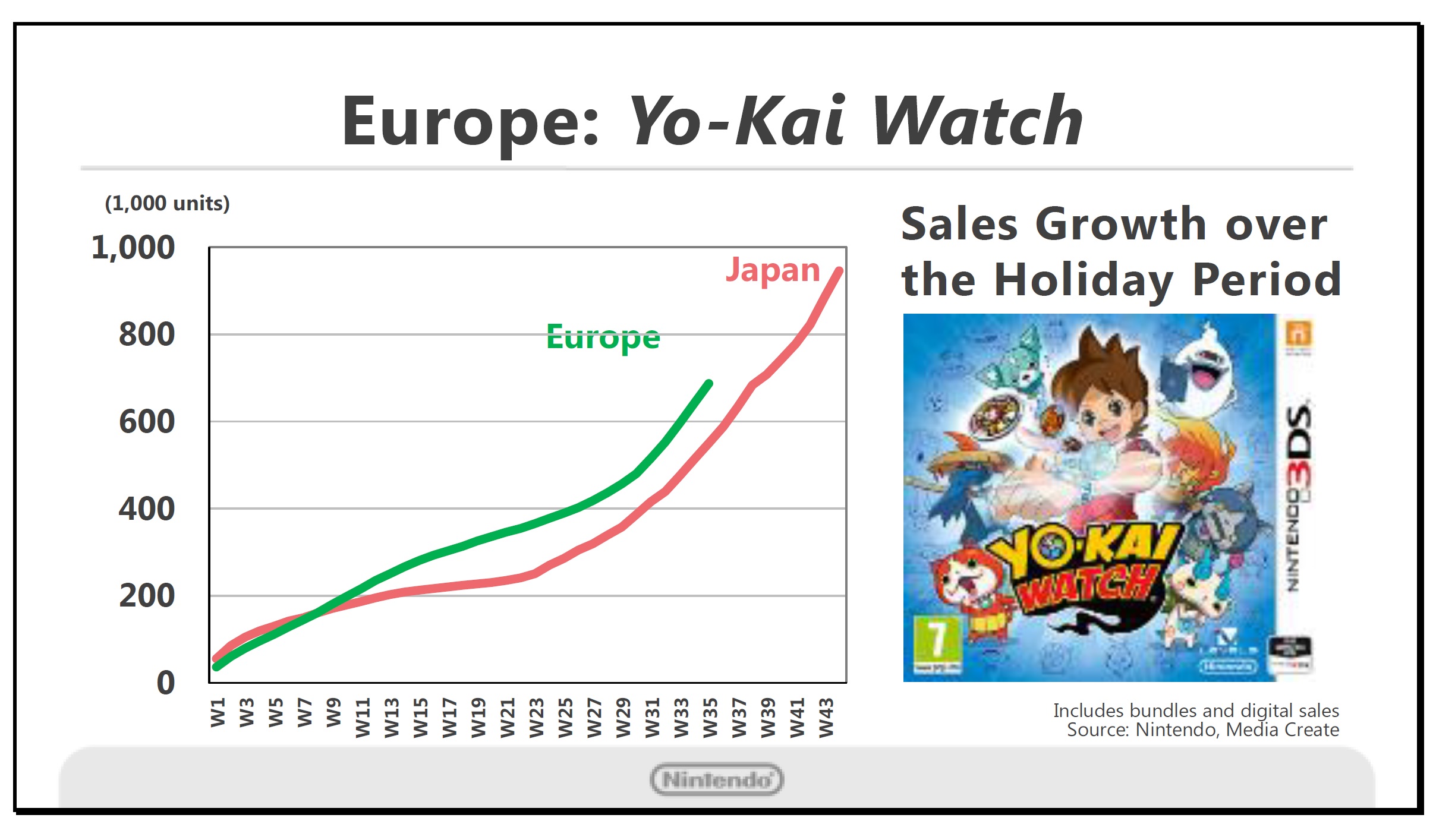 We have previously shared how the first title in the Yo-Kai Watch series, sold by our local subsidiary in the European market, was released in April last year and quickly surpassed initial sales of the Japanese release. This graph compares the sell-through in the European market with the earlier release in the Japanese market. Sales growth has maintained momentum even through the holiday period in Europe. High demand from children hoping to receive this title as a present has produced measurable results. The animated television show is also expanding to more regions, so we can expect further growth from this franchise in the future.