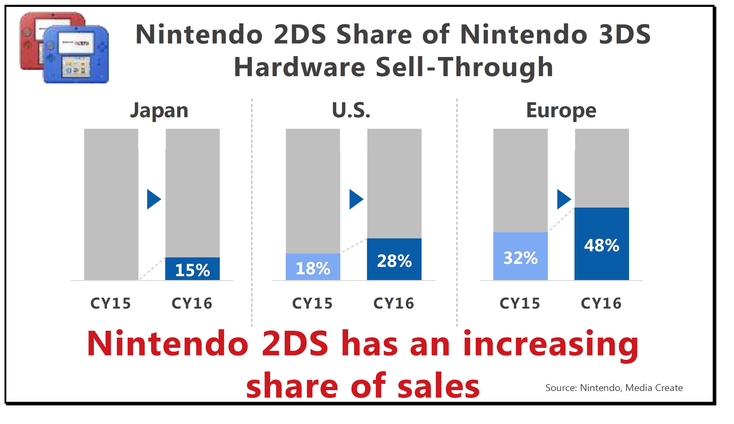 This graph shows the share of Nintendo 2DS within the total Nintendo 3DS hardware sell-through per region, compared with the previous period. Nintendo 2DS is offered at an even more affordable price than other hardware in the Nintendo 3DS family, and children can easily enjoy playing with it as their first game system. It launched in the Japanese market in September last year. We reduced the price of Nintendo 2DS in the U.S. market in May last year and saw an increase in sales that exceeded our expectations. As you can see, the share of sales held by Nintendo 2DS has grown over the previous year in the U.S. and European markets.
