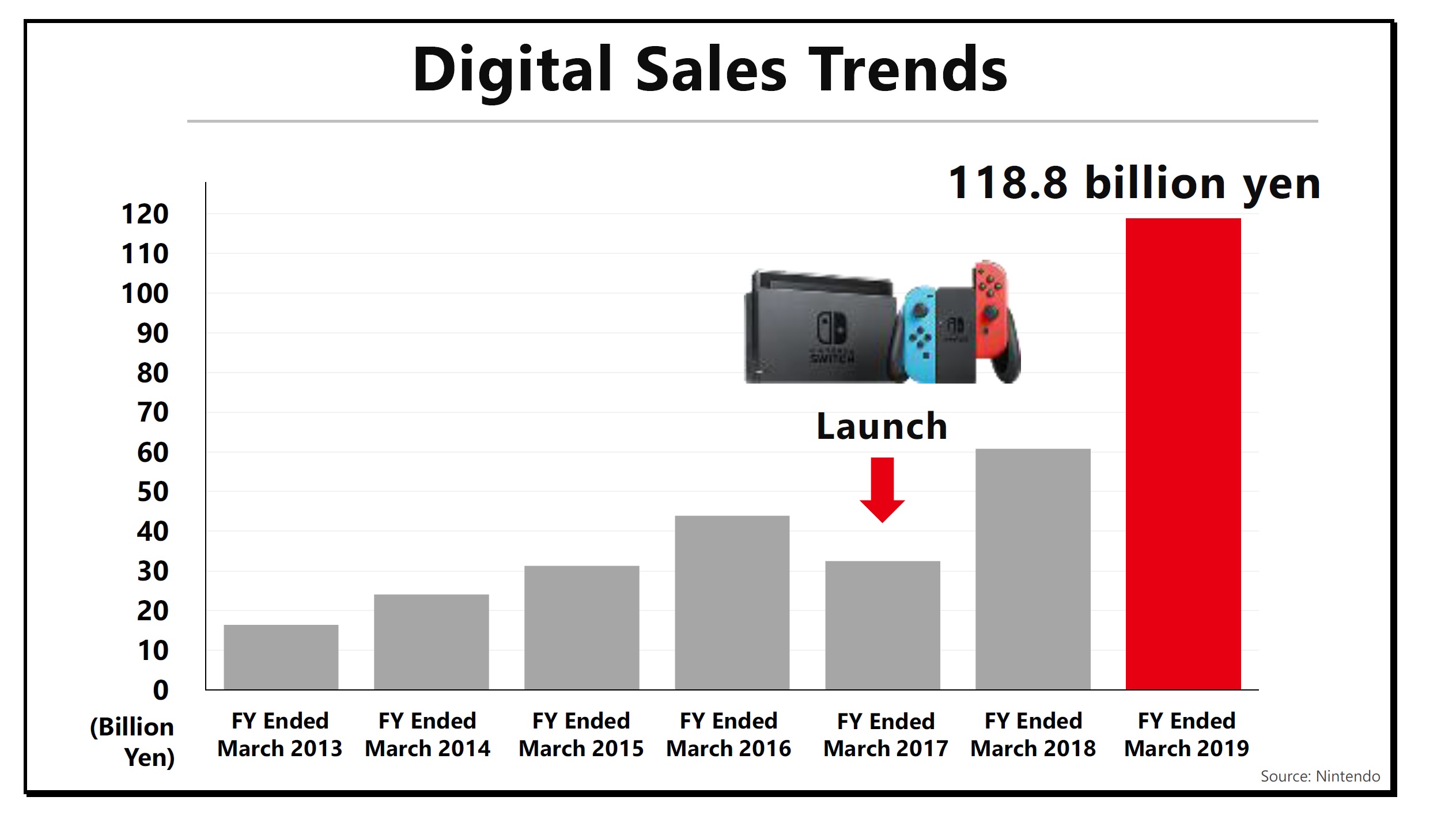 Digital sales have expanded greatly since the launch of Nintendo Switch. This graph compares sales of digital content within our dedicated video game platform business over the years. Sales nearly doubled in the fiscal year ended March 2019 compared to the previous fiscal year, and exceeded 100 billion yen for the first time ever. The Nintendo Switch business has expanded over the previous year not only in download versions of packaged software, but also in download-only software and add-on content, plus contributions from Nintendo Switch Online.