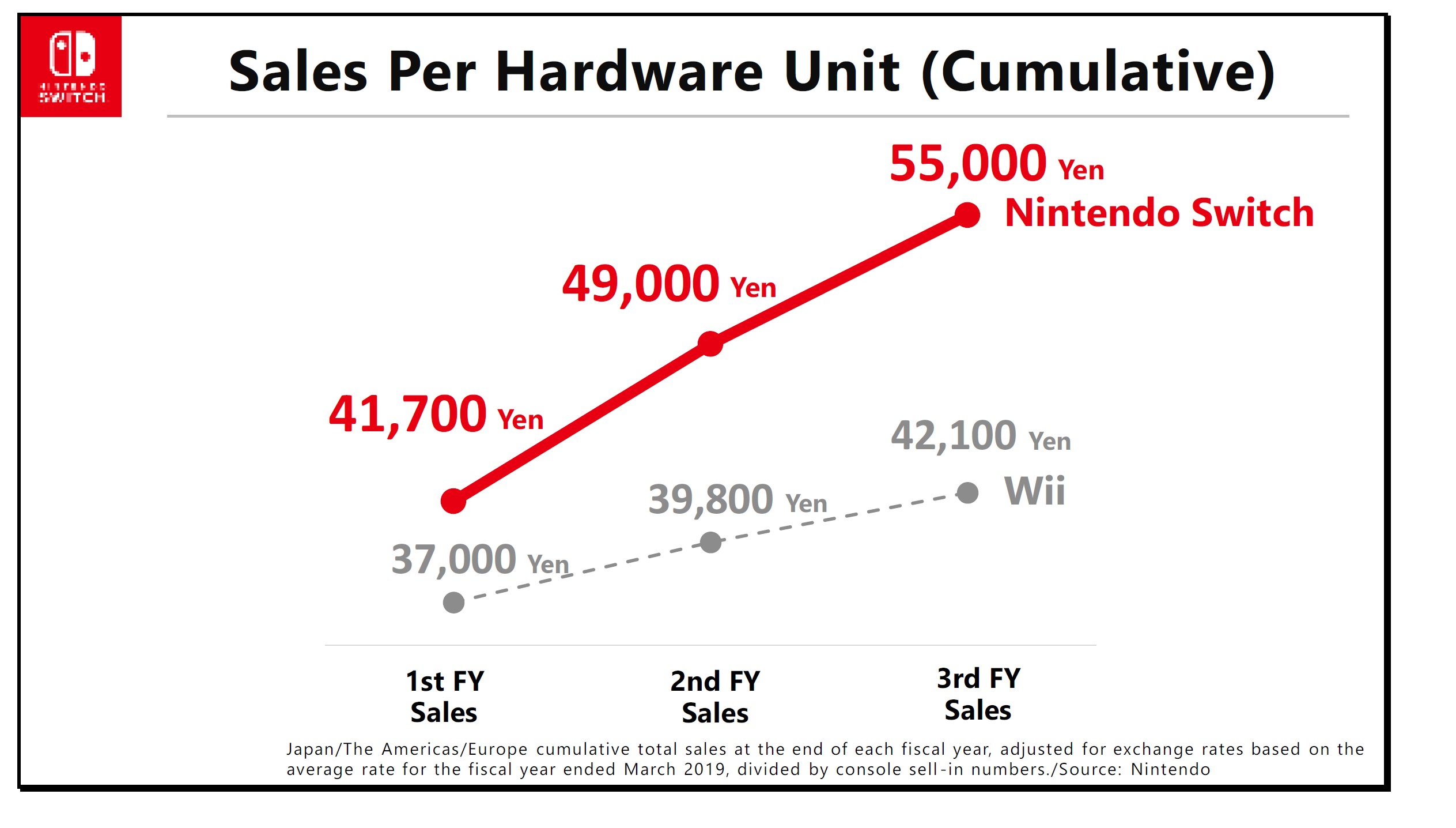 This graph shows the sales trends per Nintendo Switch system for each fiscal year. It is based on the total numbers at the end of the fiscal year for each of the three major regions, adjusted to account for differing exchange rates. For comparison, sales per Wii system are shown in gray. The figures on the slide include hardware and software sales, sales of accessories like Joy-Con controllers and the Nintendo Switch Pro Controllers, sales of titles from other software publishers physically manufactured by Nintendo on commission, add-on content sold digitally, and Nintendo Switch Online revenue.
