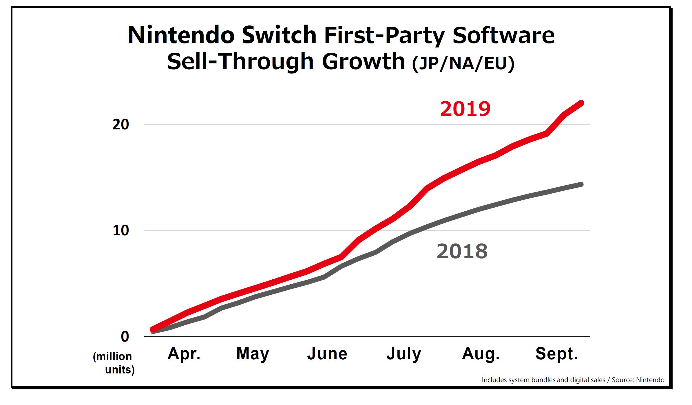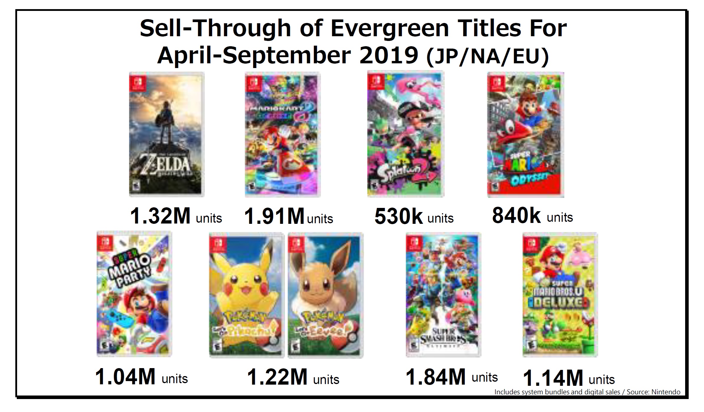As you can see, the sell-through of these evergreen titles that were released before March 2019 continued to grow since April, and have been a major presence. Consumers who purchase a new Nintendo Switch system for the first time today view these evergreen titles as equally valuable to the new titles. As the hardware spreads, we can expect the sales of these evergreen titles to continue to grow as well.