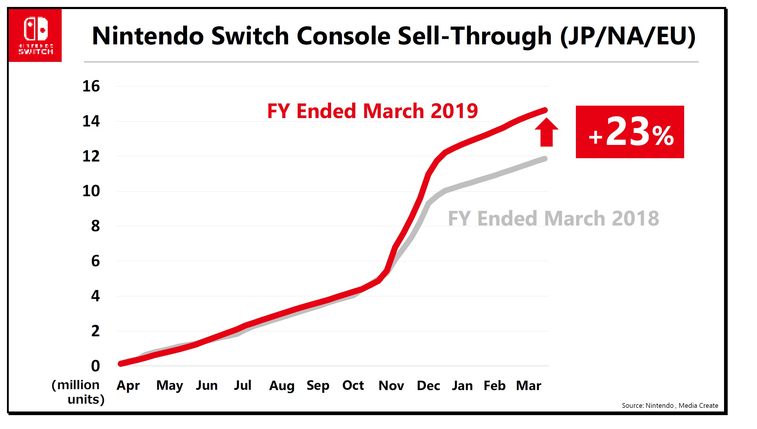 This graph shows cumulative sell-through trends throughout the full fiscal year combined for Japan, North America, and Europe. The fiscal year ended March 2018 showed explosive sales for a first year of hardware sales. The fiscal year ended March 2019 kept up that same pace until the beginning of autumn, before rising even more sharply in November. As a result, we saw a full-year increase of 23% over the previous fiscal year. And since the start of the third year of Nintendo Switch this March, the momentum of the business is still increasing.