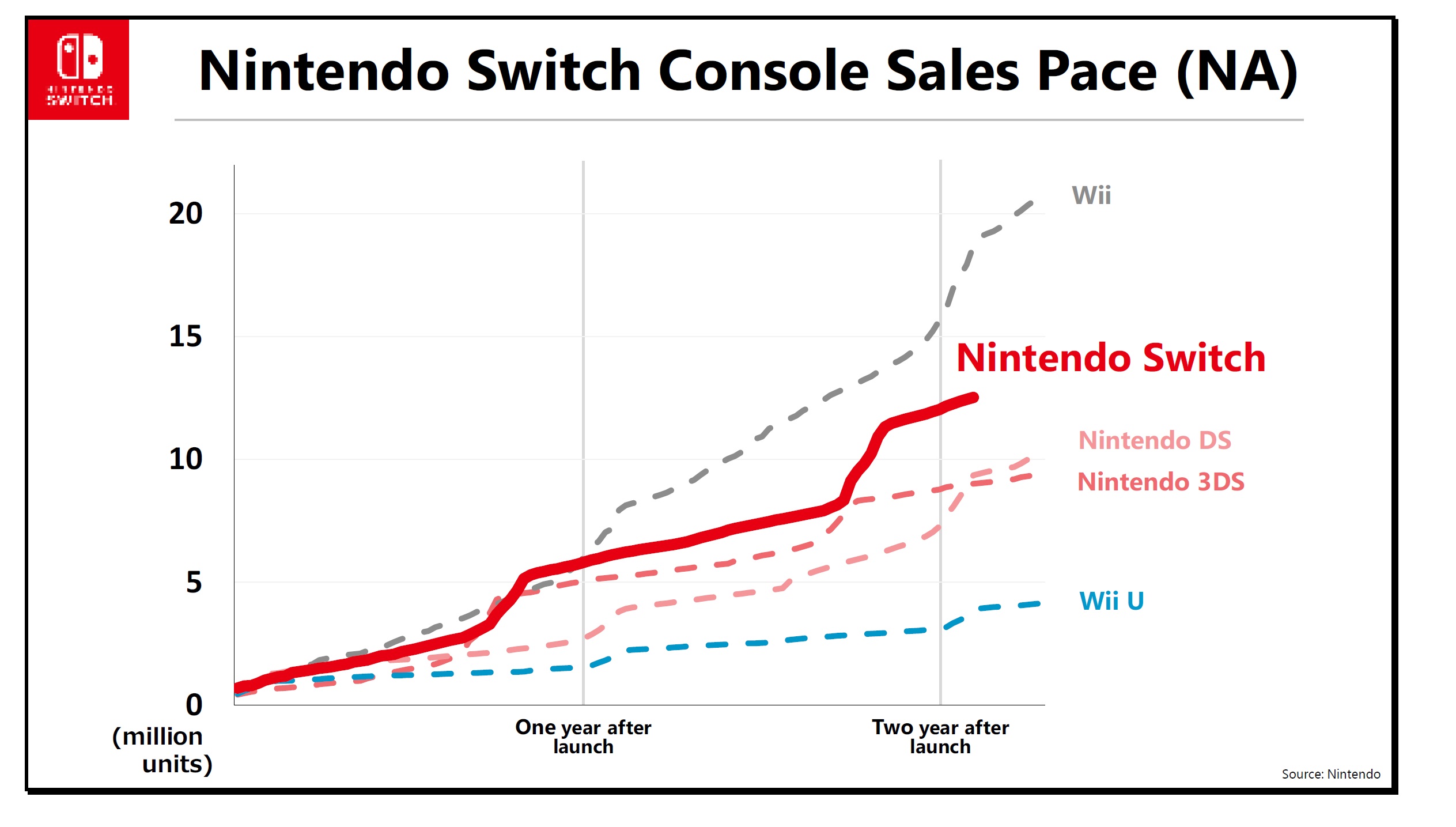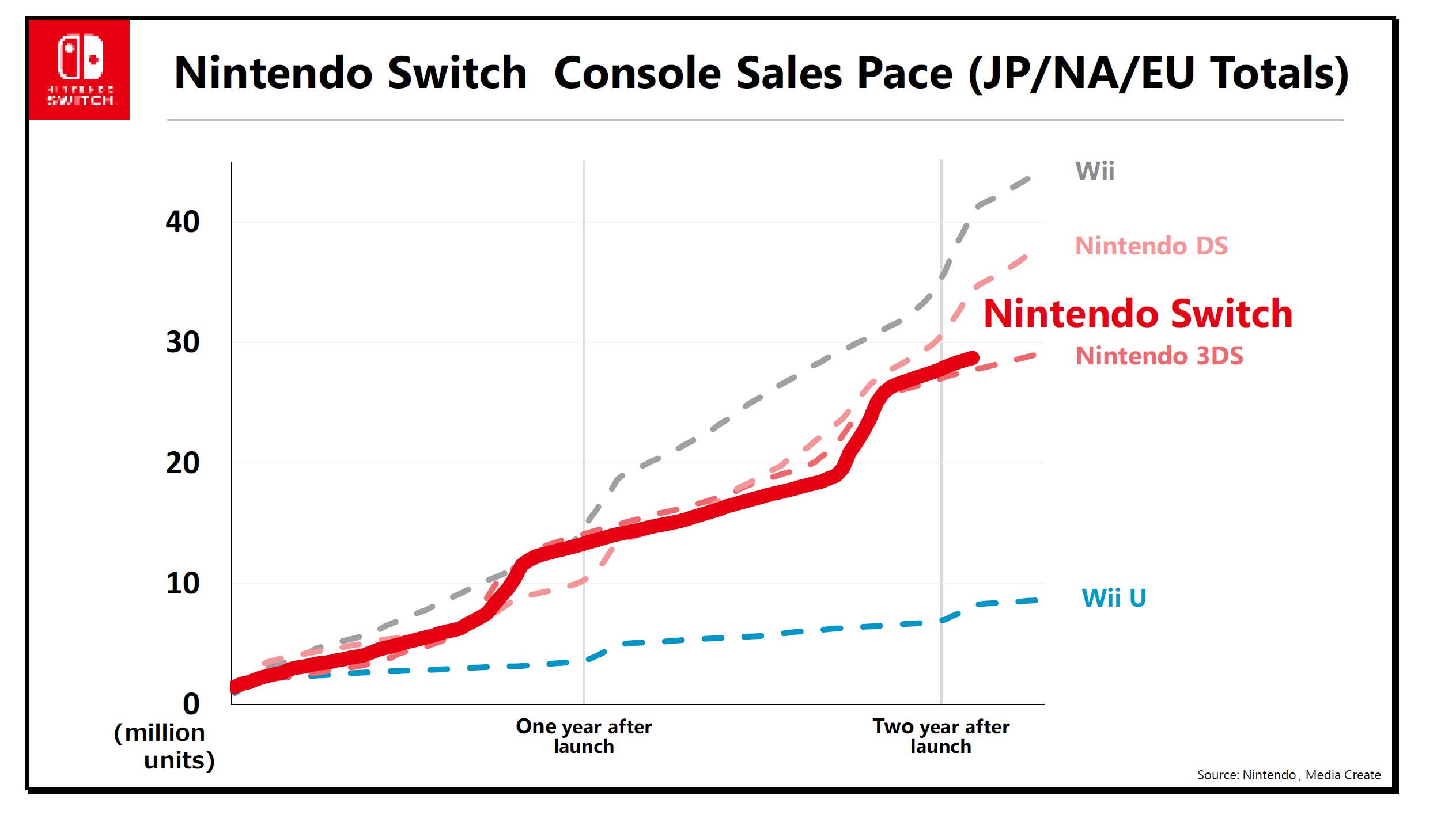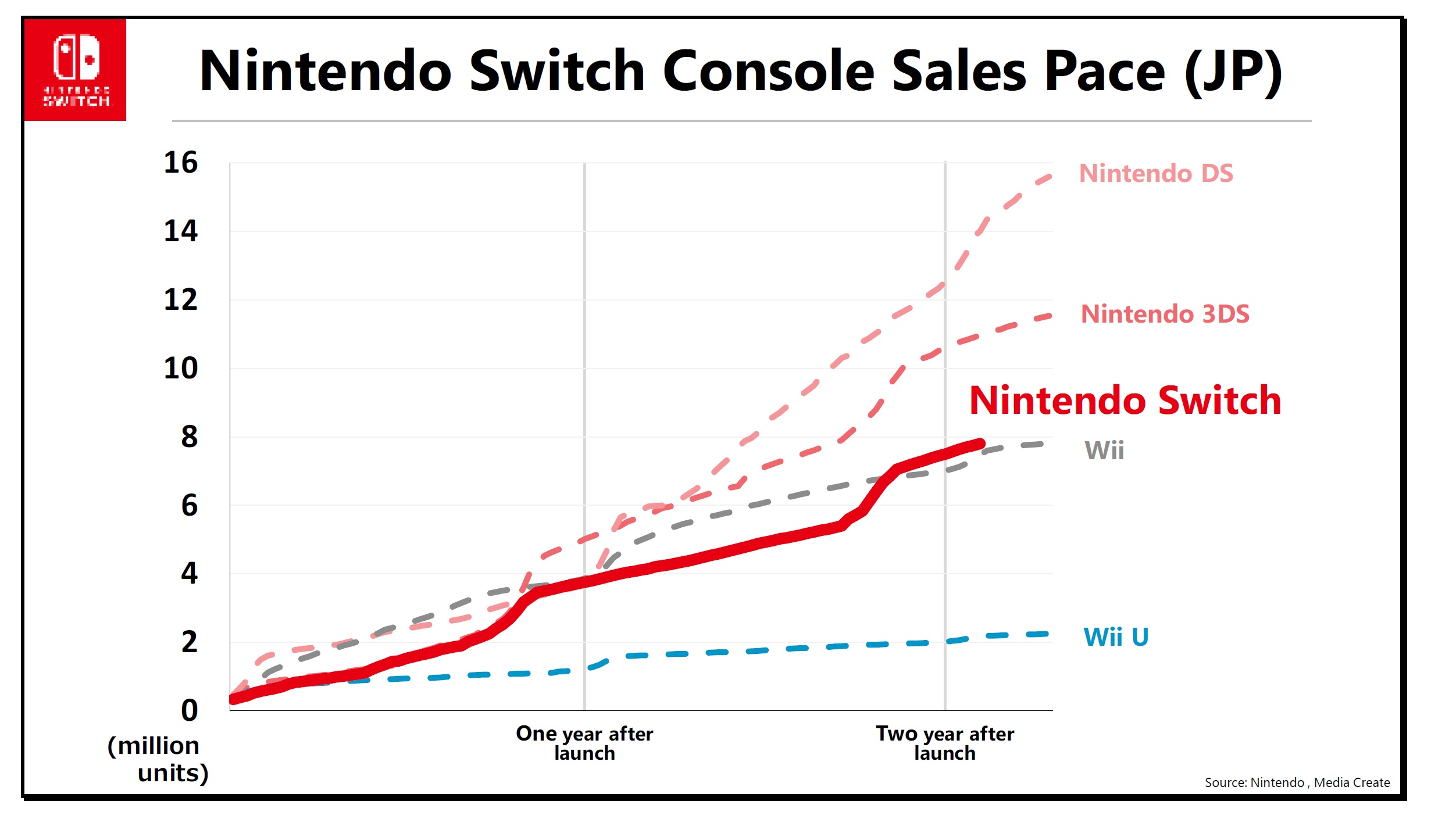 And the total numbers combined for the three regions I just explained look like this. Although there are variances from region to region, Nintendo Switch is spreading at a pace comparable to that of our previous hardware.