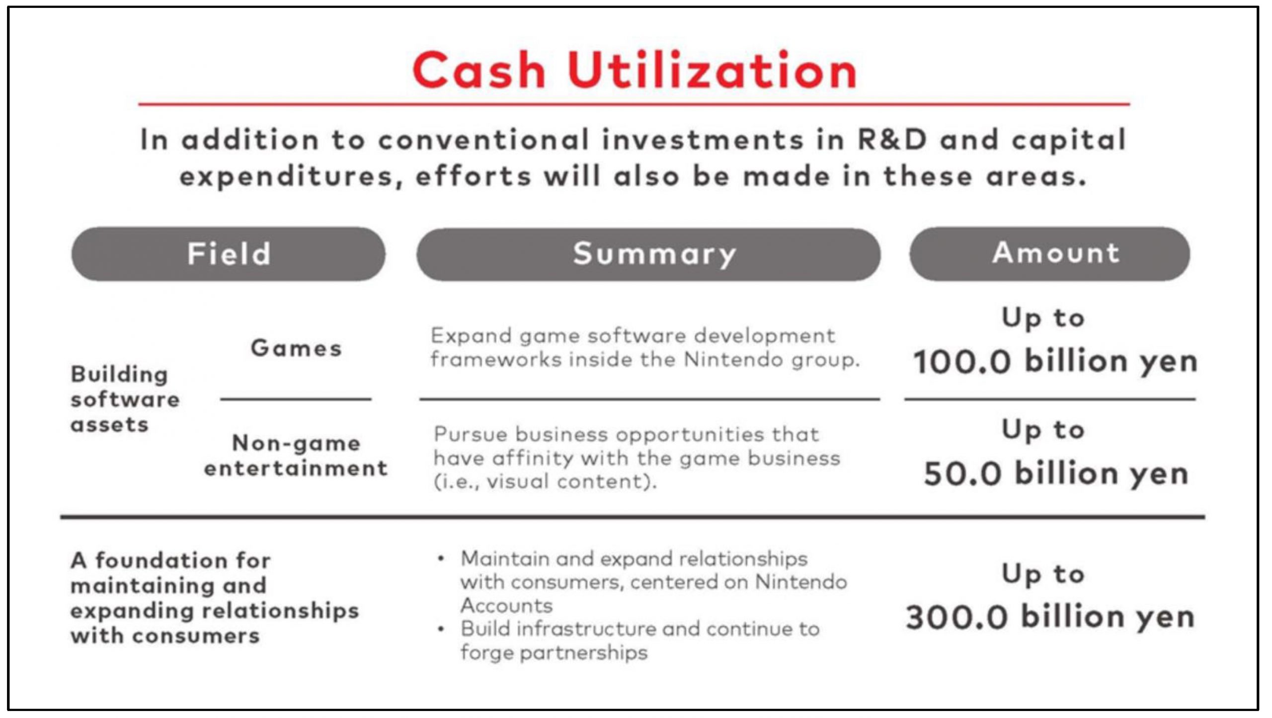 While this basic policy will not change, the Nintendo Switch business has exceeded our expectations, putting us in a strong cash position in these last few years and presenting a good opportunity to reconsider how to most effectively utilize our cash in a variety of strategic and meaningful ways.