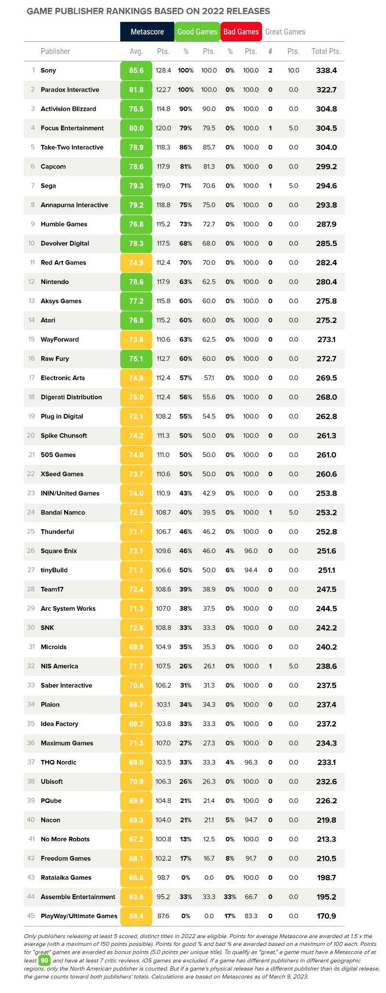If you’re curious about the top three, that goes to Sony, Paradox Interactive, and Activision Blizzard respectively. Their Metascores were 85.6, 81.8, and 76.5. Activision Blizzard did have a lower Metascore than Nintendo, but the rankings are about points. Points are dished out based on the average Metascore for the year, % of scored products with good reviews, % of scored products with bad reviews, and number of “great” titles. More information can be found here.