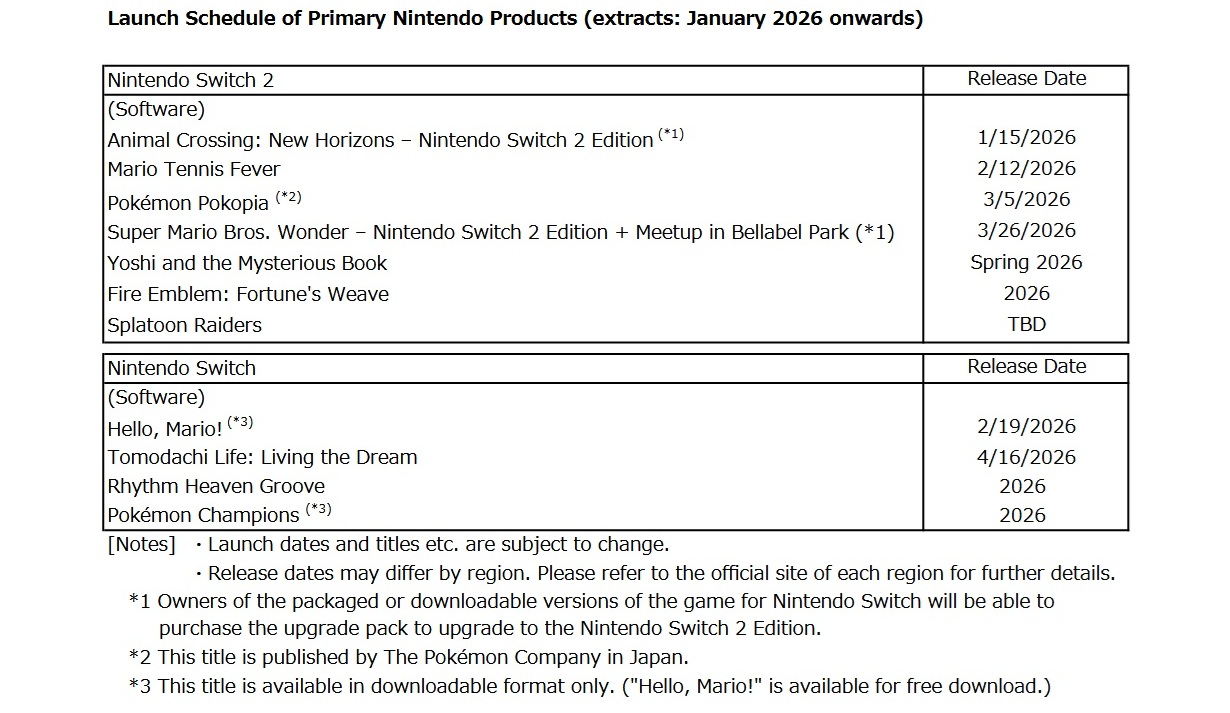 The latest Nintendo release schedule has now gone live as part of the company’s February 2026 financial report.
