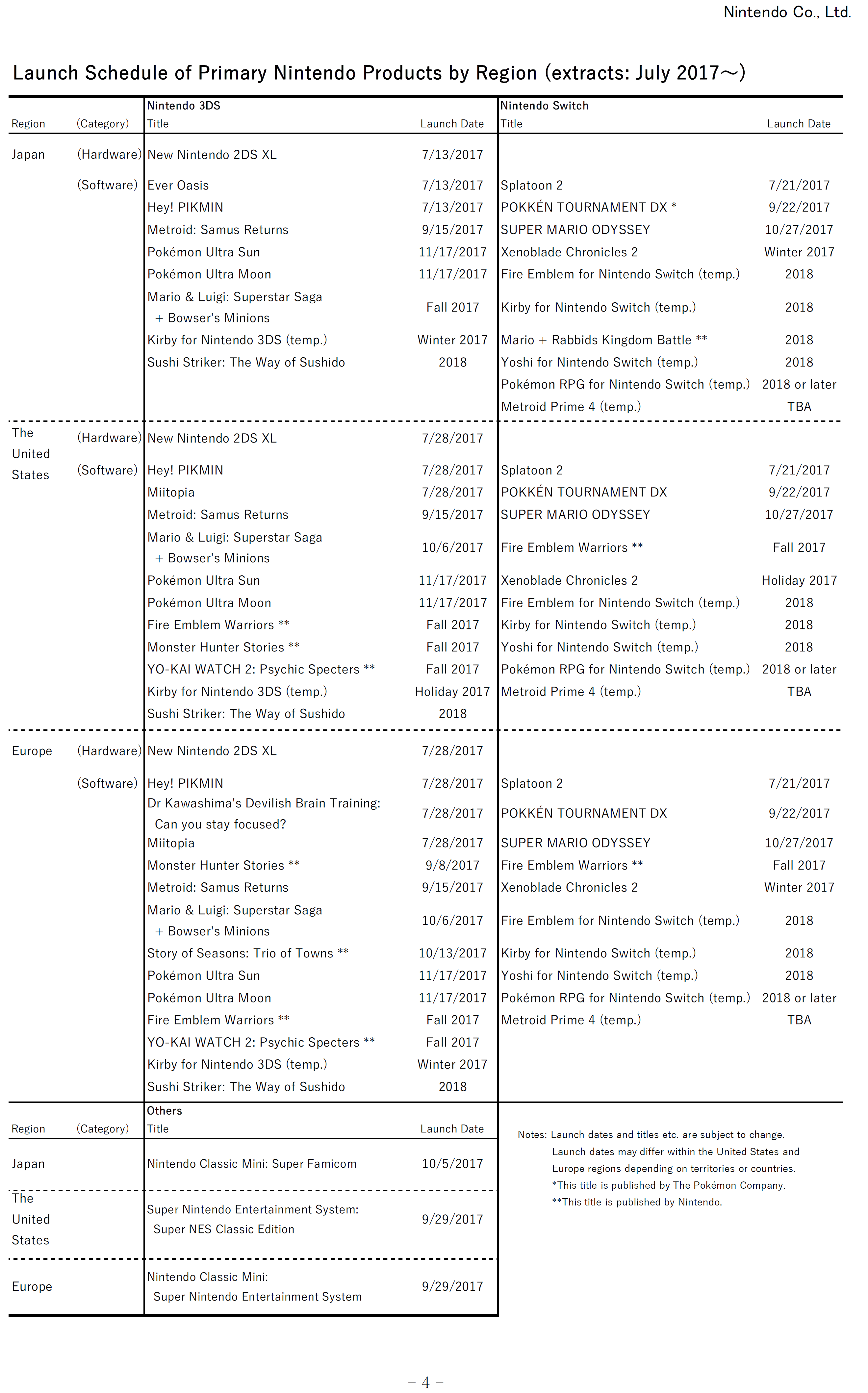 Included in Nintendo’s latest financial results documents is the upcoming release schedule for Switch and 3DS. It offers a look at what’s to come for both platforms from a first and third-party perspective. Find the latest schedule below.