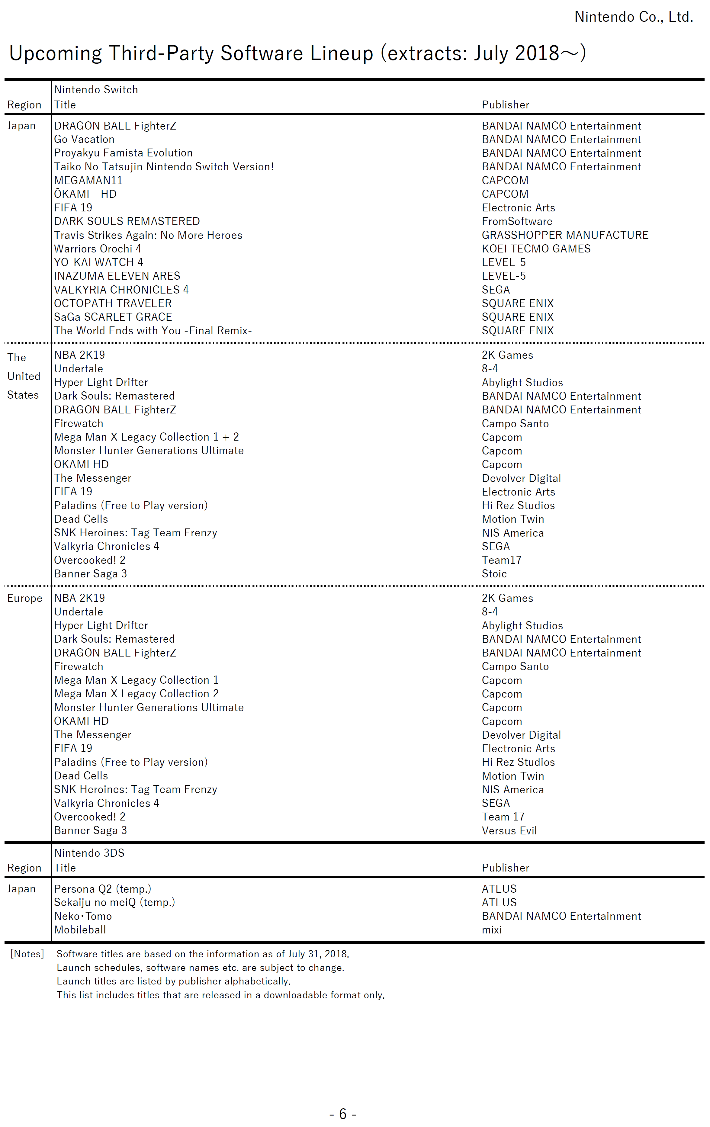 Included in Nintendo’s latest financial results documents is the upcoming release schedule for Switch and 3DS. Aside from a look at what’s to come from a first-party perspective, it also provides an overview of some planned third-party titles. We’ve attached the latest schedule below.