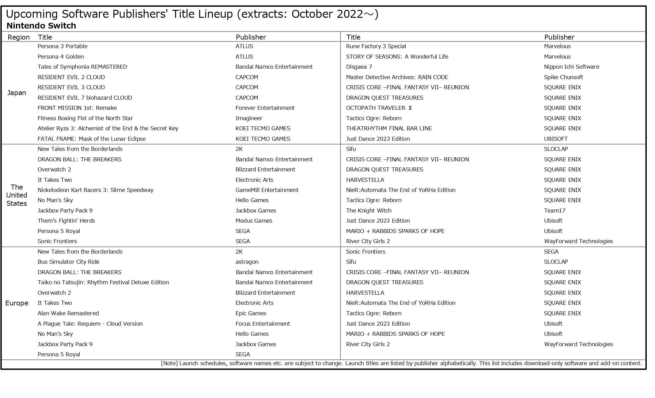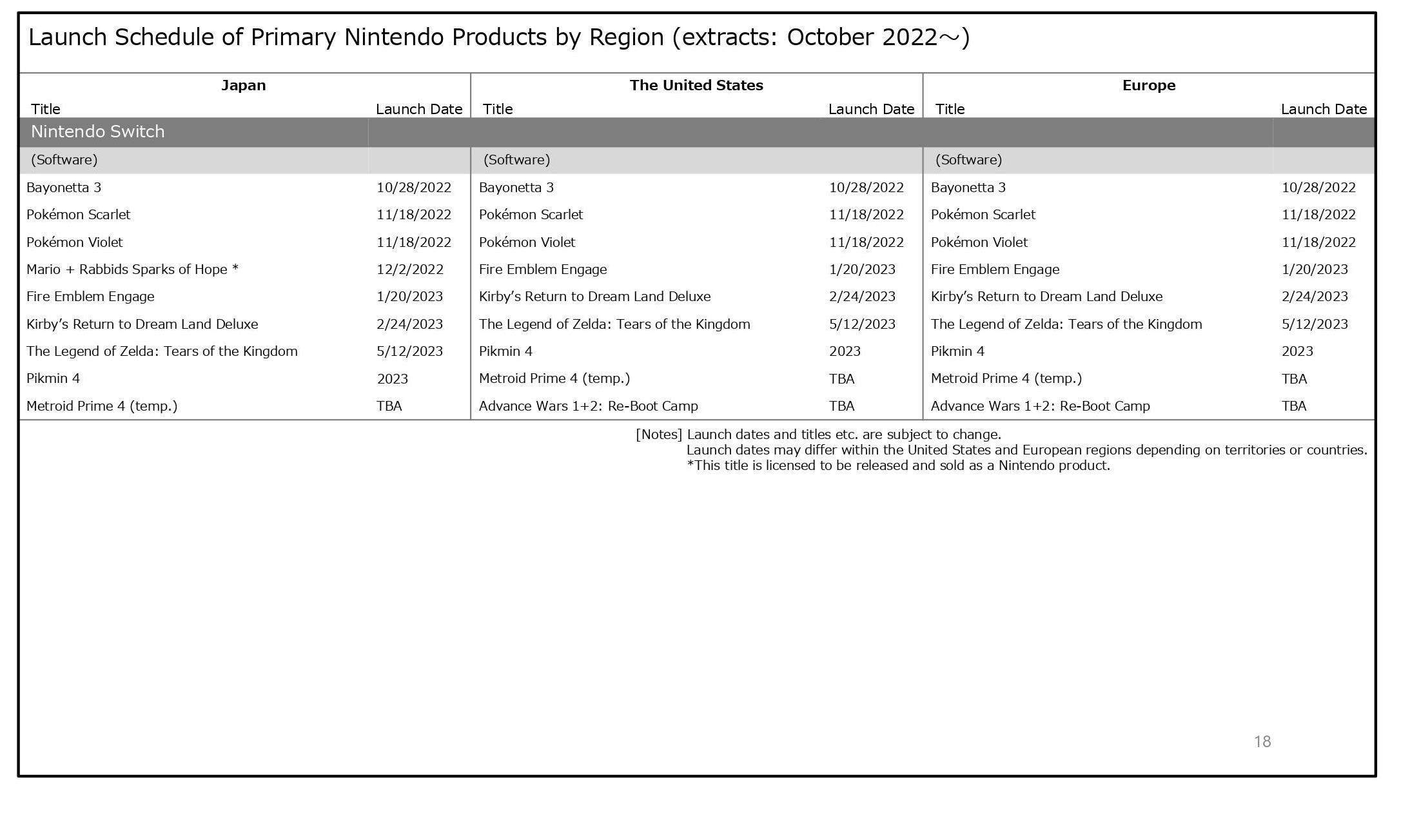 As of now there aren’t major surprises. Zelda: Tears of the Kingdom, which was given its May 2023 release window in September, is now properly reflected here. Advance Wars 1+2: Re-Boot Camp still doesn’t have a release window, and the same goes for Metroid Prime 4.