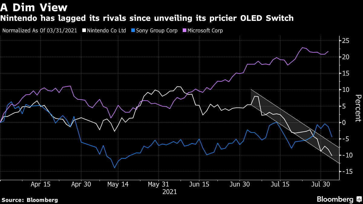 It seems Nintendo’s quarterly profit did not reach its estimates and investors are beginning to pull out; possibly due to worries that the handheld console market has hit its peak as the pandemic lessens in parts of the globe. Additionally, the new OLED Switch model has some investors questioning Nintendo as their sales slowed since its announcement and profits for Sony and Microsoft have increased (seen in the graph from Bloomberg below).