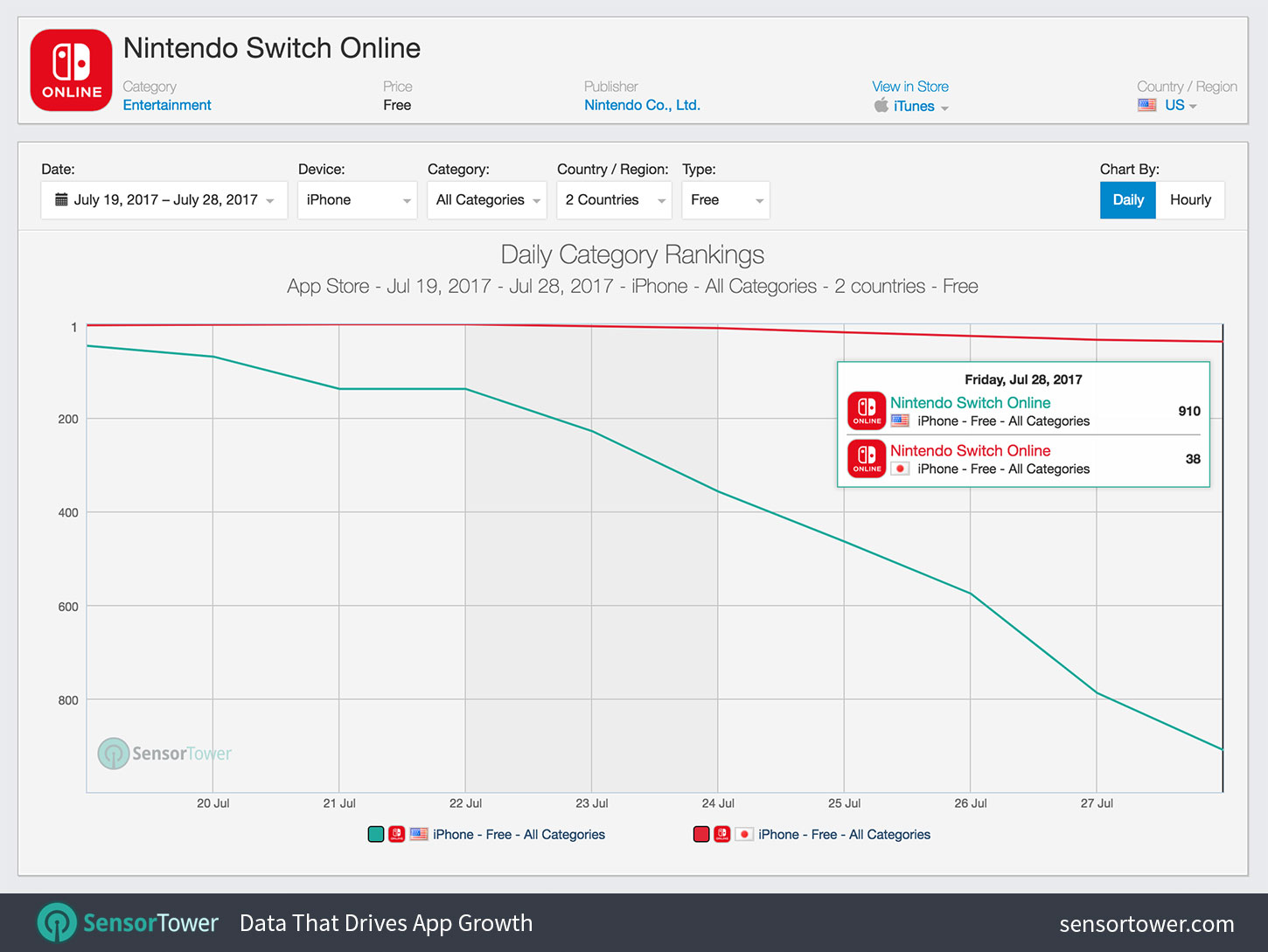 Sensor Tower adds that there was an initial surge in downloads in the U.S. and Japan. After this, the app saw a more rapid decline in new installs for the U.S. in subsequent days. Nintendo Switch Online has been available for ten days in total.