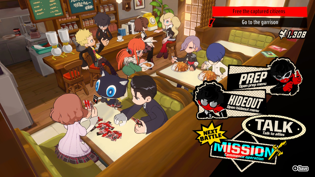 In between combat encounters, players will spend their free time at Café Leblanc – this generally acts as the home base for Phantom Thieves outside of battle. While it’s basically a glorified menu, I got a chuckle out of watching the Phantom Thieves kill time by playing cards, eating curry and hanging out. Visually, Leblanc looks a bit different this time around thanks to the chibi-esque art style of the 3D character models. I’m not the biggest fan of it, but it’s a good representation of the lighter tone of the spin-off compared to Persona 5.