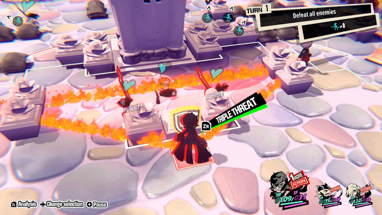 Manage to make an enemy vulnerable and the player can dish out a critical attack, which not only deals extra damage but also lets the player take another turn. This is a spin on the “One More” mechanic from Persona 5 and is immensely powerful. It’s totally possible to stack One More attacks and keep a turn going on and on, sprinting around the map and obliterating enemies. It’s really satisfying to pull off, and any time I saw the text prompt indicating I had opened up a foe for a critical hit, I knew I was setting myself up for a good run.