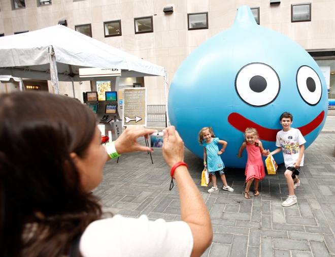 In this photo provided by Nintendo of America, Kayla F., Jenna F., and Matthew F. from Staten Island, NY pose for their mother in front of a replica of Slime, the beloved character from the fan-favorite DRAGON QUEST video game series at a launch event for DRAGON QUEST IX: Sentinels of the Starry Skies for the Nintendo DS family of systems on July 10, 2010 at the Nintendo World store in New York. The game, which launches in the U.S. on July 11, lets players customize their own adventures and share their experiences with friends.