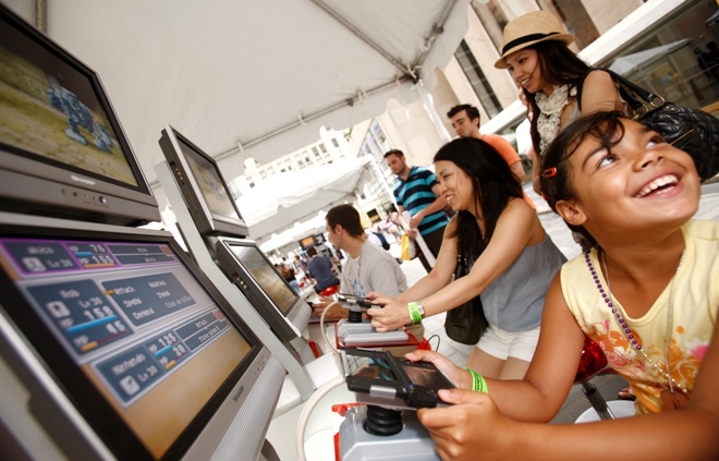 In this photo provided by Nintendo of America, Peter Michael H., 13 (left), Andrew H., 4 (center), and Isabelle H., 10 (right), from The Bronx, N.Y., enjoy the social multiplayer experience of DRAGON QUEST IX: Sentinels of the Starry Skies at a launch event at the Nintendo World store in New York on July 10, 2010. The game for the Nintendo DS family of systems launches on July 11, 2010.