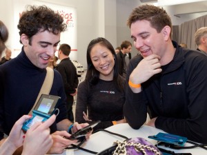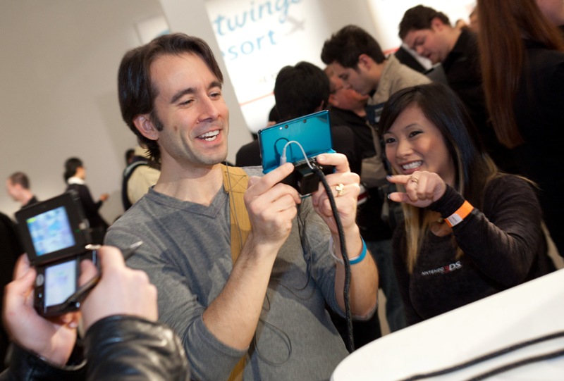 In this photo provided by Nintendo of America, members of the media enjoy hands-on time with upcoming games for the Nintendo 3DS portable game system at Skylight Soho in New York on Jan. 19. The Nintendo 3DS launches in the United States on March 27 and offers realistic, immersive 3D gaming without the need for special glasses. (Matt Peyton/AP for Nintendo of America)