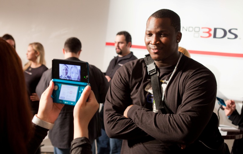 In this photo provided by Nintendo of America, Antwand Pearman of GamerFitNation plays around with the Nintendo 3DS Camera in New York on Jan. 19, 2011. The Nintendo 3DS launches in the United States on March 27 and offers a realistic, immersive 3D gaming experience without the need for special glasses. (Matt Peyton/AP for Nintendo of America)