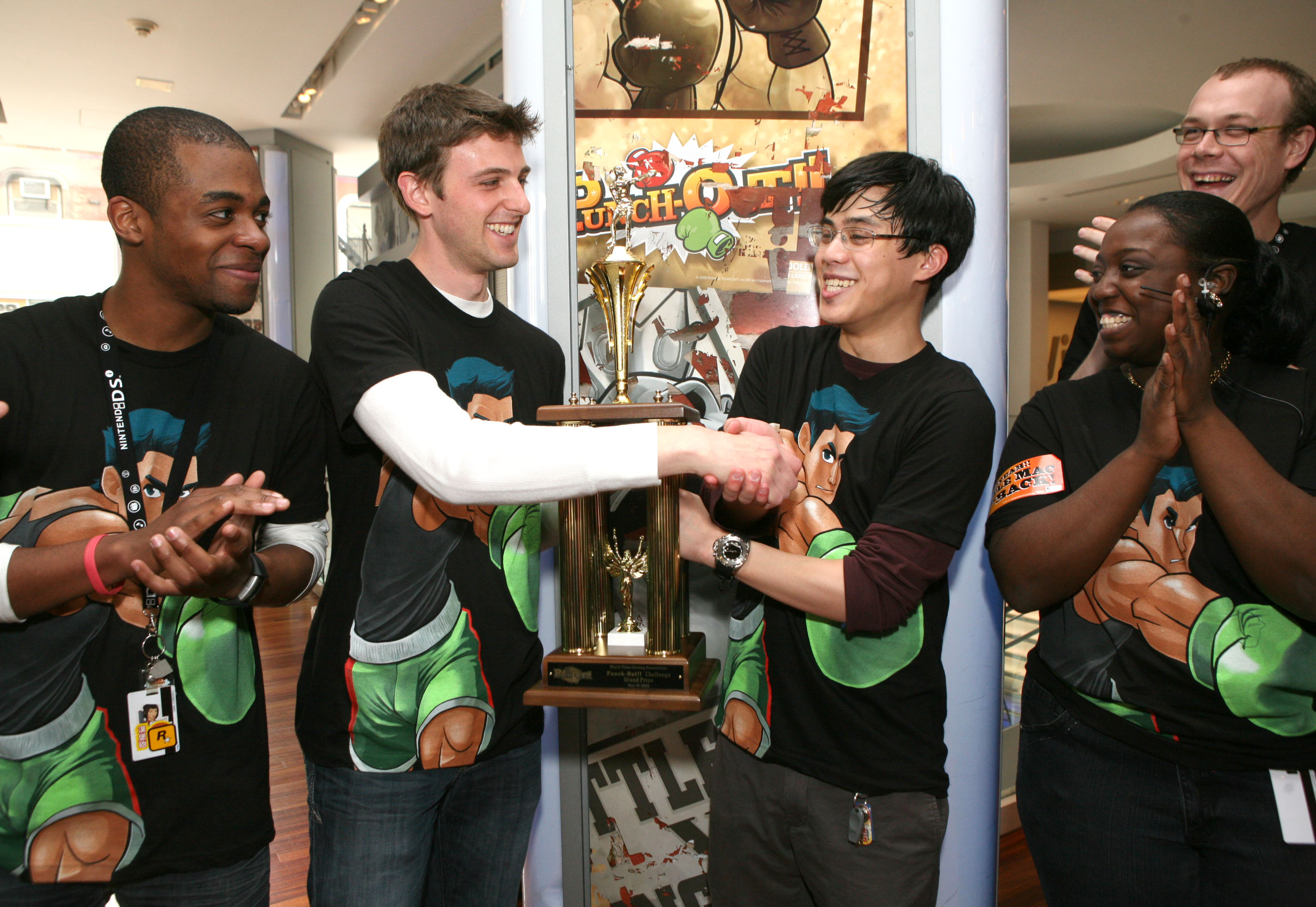 Kit Ellis, Nintendo of America’s Manager of Public Relations, presents the World Video Boxing Association champion trophy to Cyr F., of Jersey City, N.J., at the Nintendo World store in New York, Saturday, May 16, 2009. Cyr F. bested dozens of opponents in a Punch-Out!! challenge that gave Nintendo fans the chance to experience the highly-anticipated game before it hit store shelves.