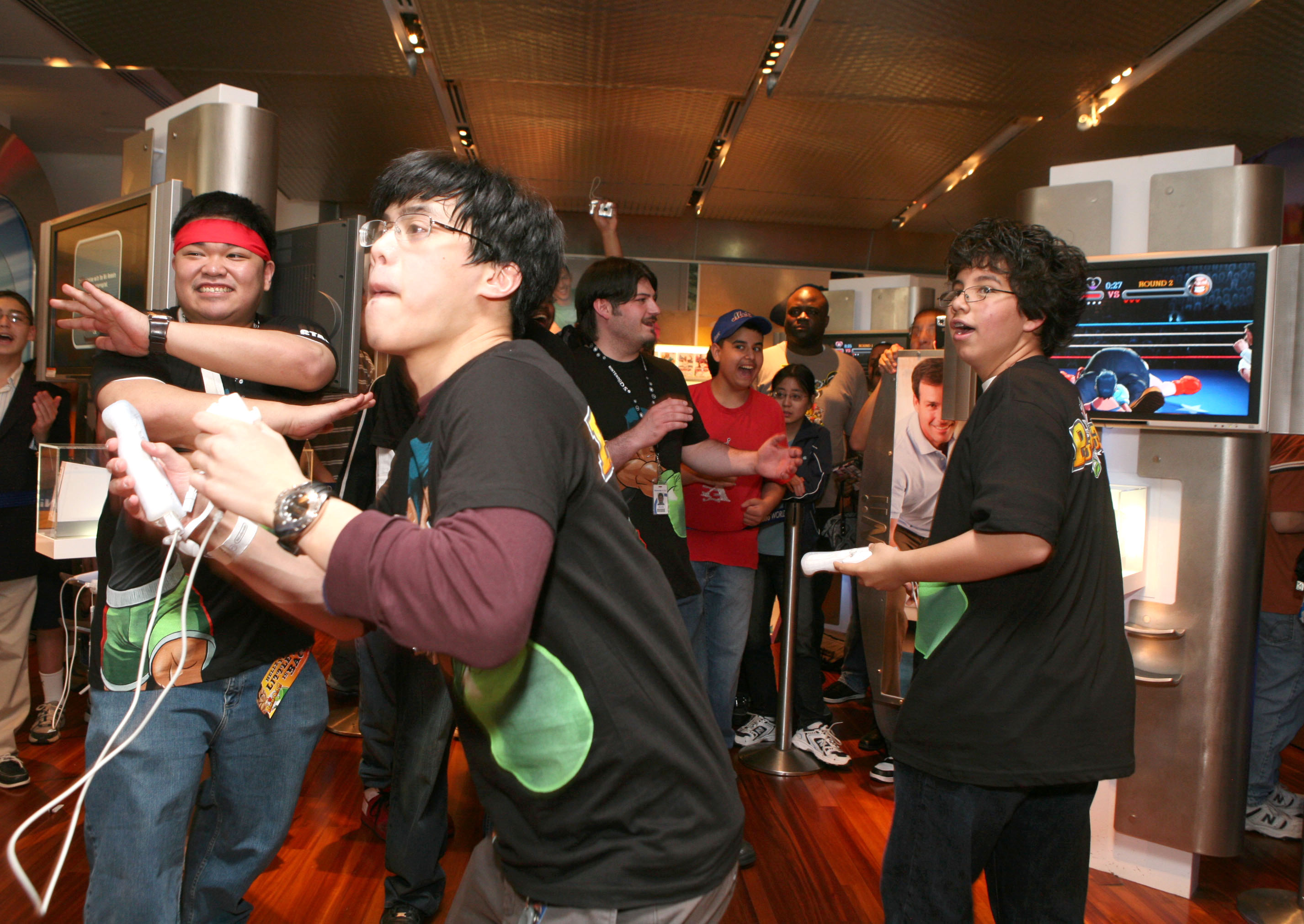 Cyr F., second left, of Jersey City, N.J., competes against Ariel C., right, of Queens, N.Y., in the final round to determine the grand-prize winner of the Punch-Out!! challenge at the Nintendo World store in New York, Saturday, May 16, 2009. Fans lined up to play and be among the first in the U.S. to purchase the new Punch-Out!! game for the Wii console which launches May 18.