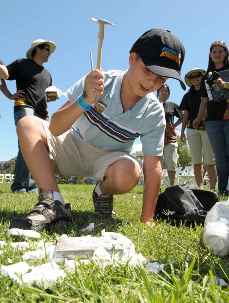 Eric S., 8, of Miami, Florida breaks open a ”fossilized” copy of Fossil Fighters for the Nintendo DS and Nintendo DSi portable games systems at the La Brea Tar Pits, Thursday, August 6, 2009 in Los Angeles. Eric won a game play tournament at the event to celebrate the game’s upcoming release on August 10, 2009. (Photo by Nintendo, Bob Riha, Jr.)