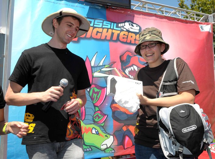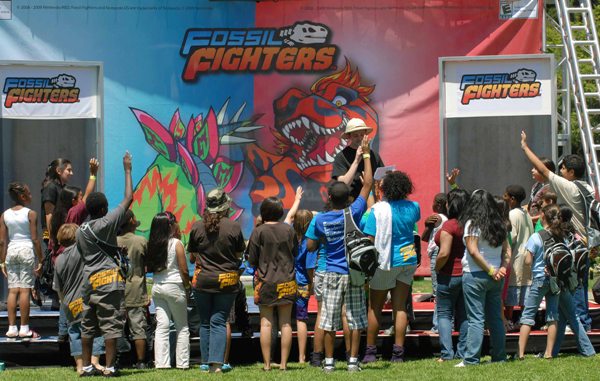 Kit Ellis, Nintendo of America’s Manager of Public Relations, quizzes young video game fans on fossil trivia to collect prizes at a Los Angeles event to celebrate the upcoming release of Fossil Fighters for the Nintendo DS and Nintendo DSi portable video game systems. Fossil Fighters will be released on August 10, 2009. (Photo by Nintendo, Bob Riha, Jr.)