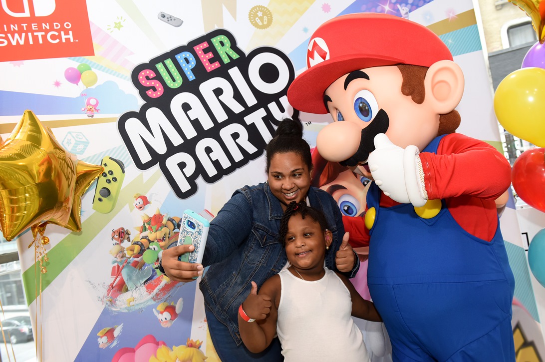 In this photo provided by Nintendo of America, Shirley M. and Gabriella A., 5, of New York, NY, celebrate the launch of the Super Mario Party and Luigi’s Mansion games by posing with Mario during a special event at the Nintendo NY store in Rockefeller Plaza. An action-packed party game with 80 interactive mini-games, Super Mario Party is now available for the Nintendo Switch system. The spooky classic game Luigi’s Mansion will be available for the Nintendo 3DS family of systems on Oct. 12.