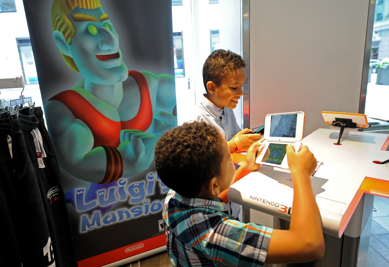 In this photo provided by Nintendo of America, Joshua A., 9 and Jacob A., 6, of Brooklyn, NY, help Luigi in his spooky adventure by playing the Luigi’s Mansion on the New Nintendo 2DS XL during a special event at the Nintendo NY store in Rockefeller Plaza. The classic game Luigi’s Mansion will be available for the Nintendo 3DS family of systems on Oct. 12.
