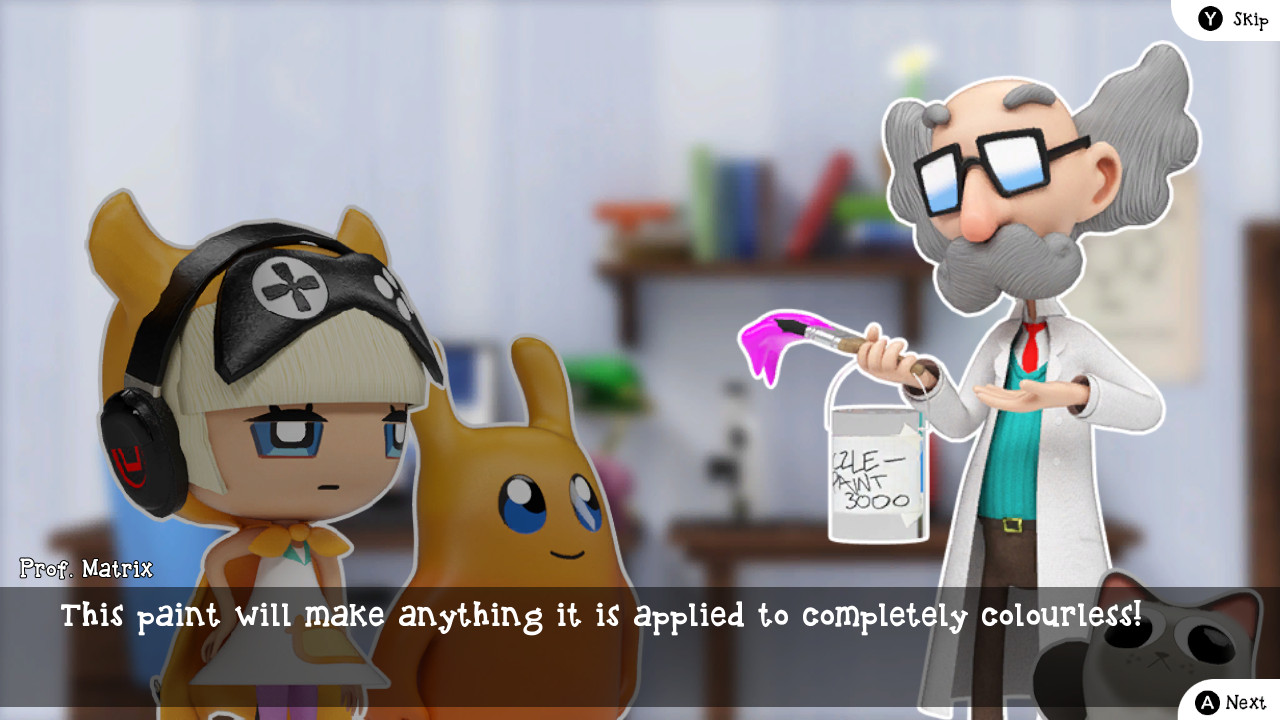 Inventive genius professor Matrix has created a paint, Piczle Paint 3000, that can leech the color out of anything it covers. His inventions, including this one, are not safe in the hands of Score-chan. Can you help her and Gig undo the great chaos created by her inevitable mishandling of Piczle Paint 3000? Also there is bug the cat who is naturally more concerned with cat matters.
