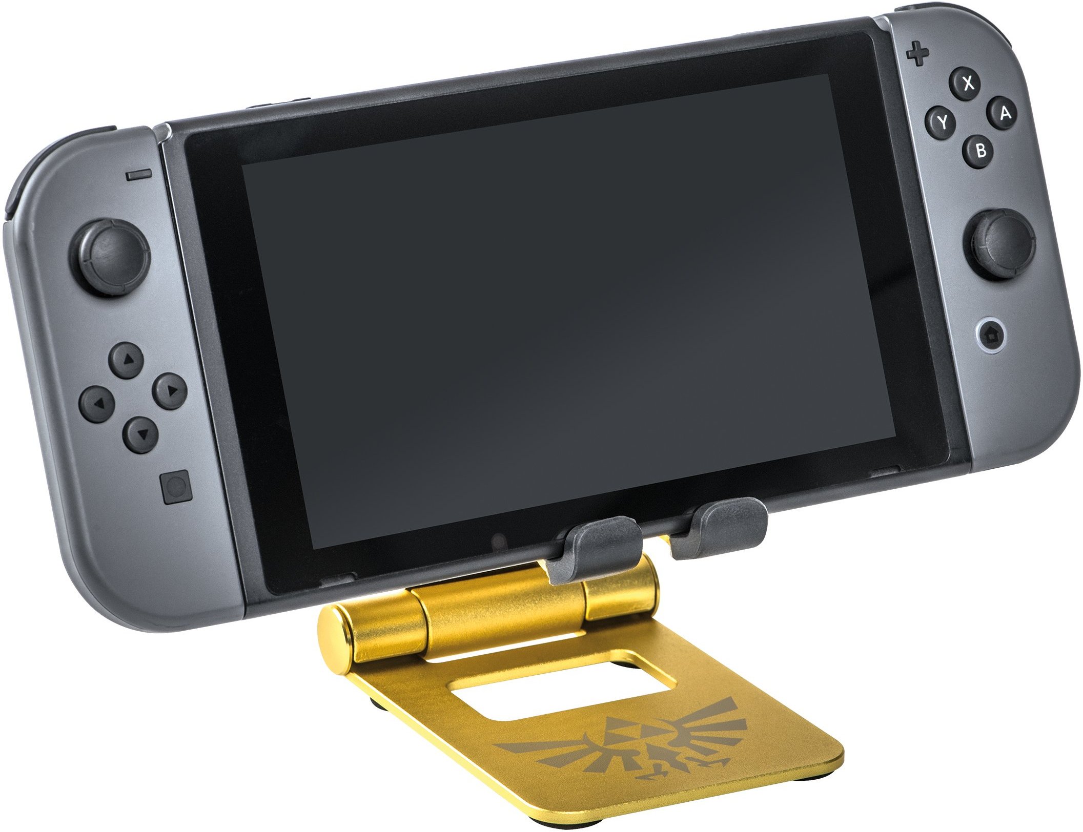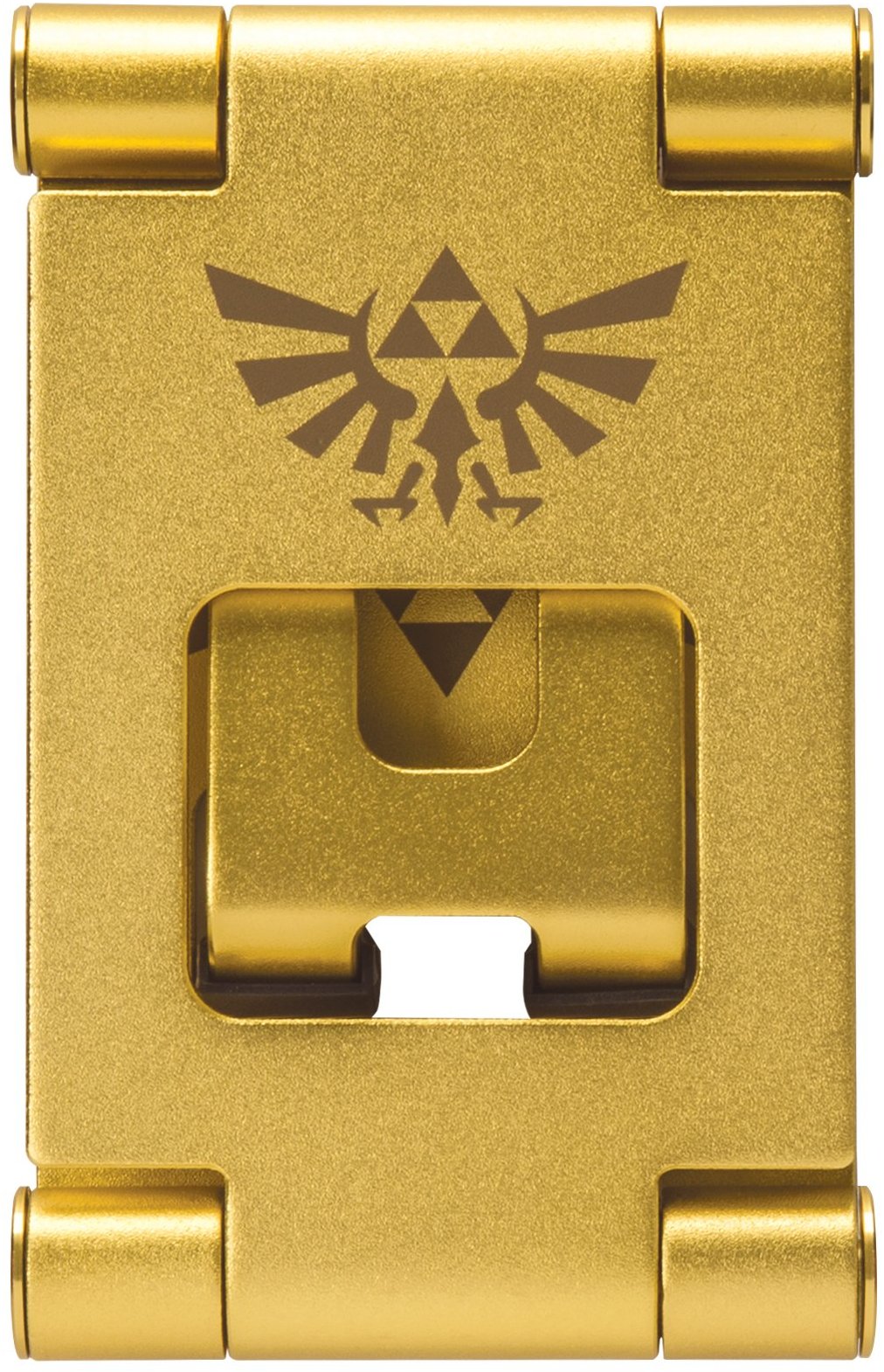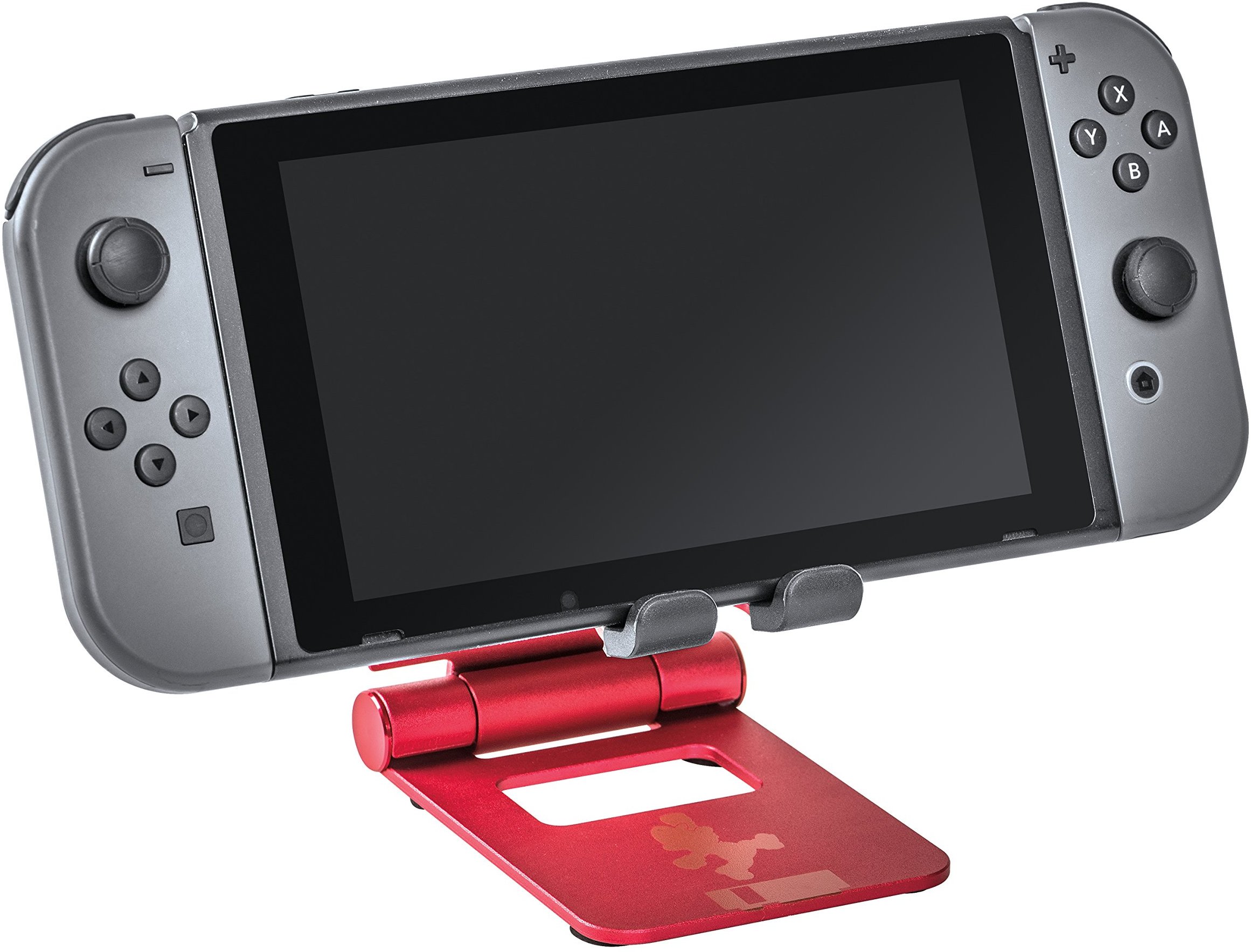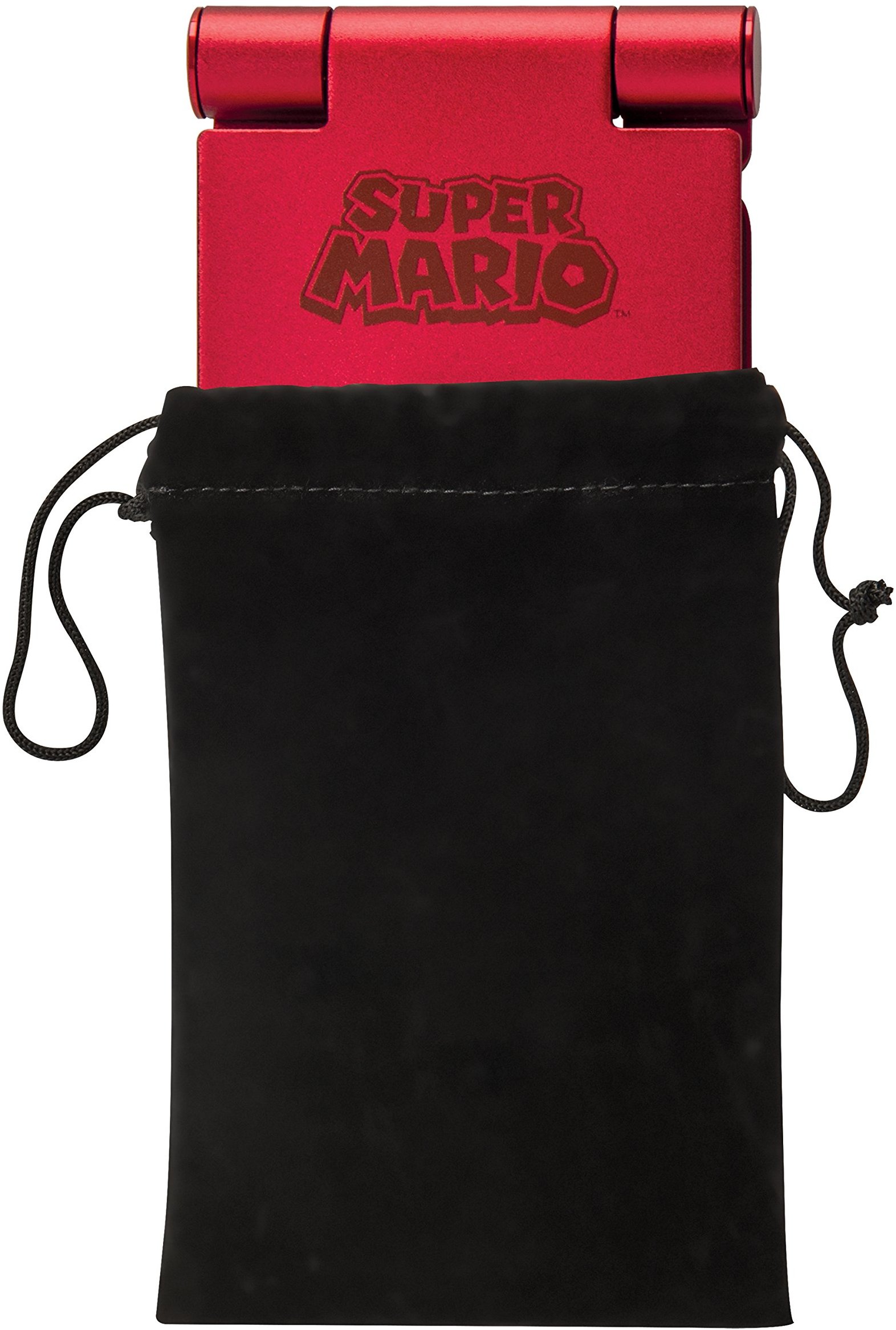 Officially licensed by Nintendo, the “Super Mario” / “Zelda: Breath of the Wild” Compact Metal Stand is designed to hold the Nintendo Switch so you can play and charge at home or on-the-go. Made of durable aluminum alloy, this stand features 2-point articulation for adjustable viewing angles. Anti-slip rubber pads keep the Nintendo Switch in place and prevent the stand from sliding. Its fold-away design fits right in your pocket or in the included drawstring travel bag. Take this stand anywhere to play in tabletop mode.