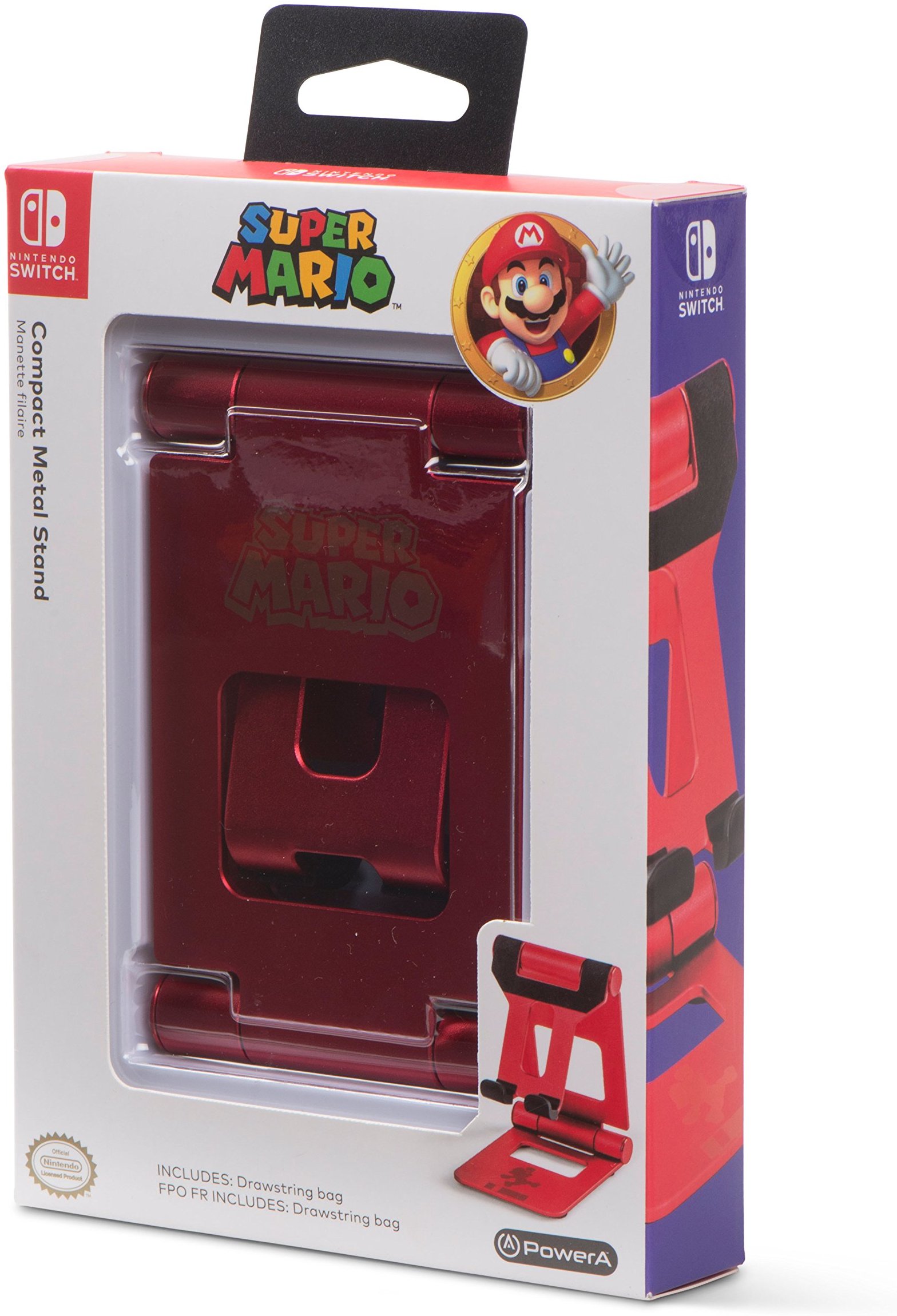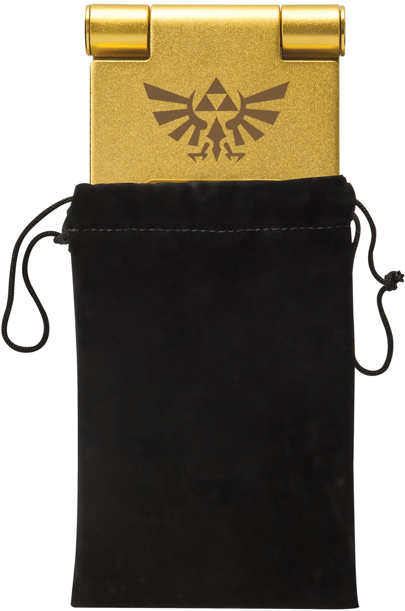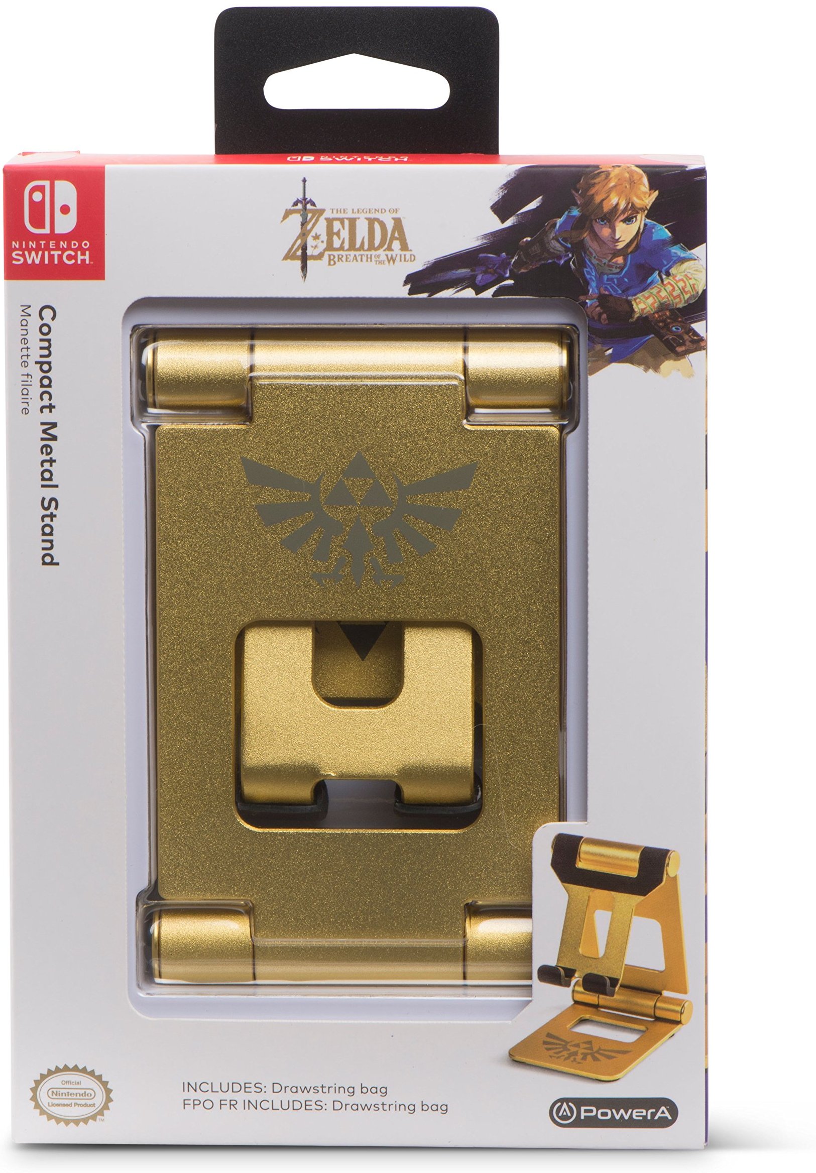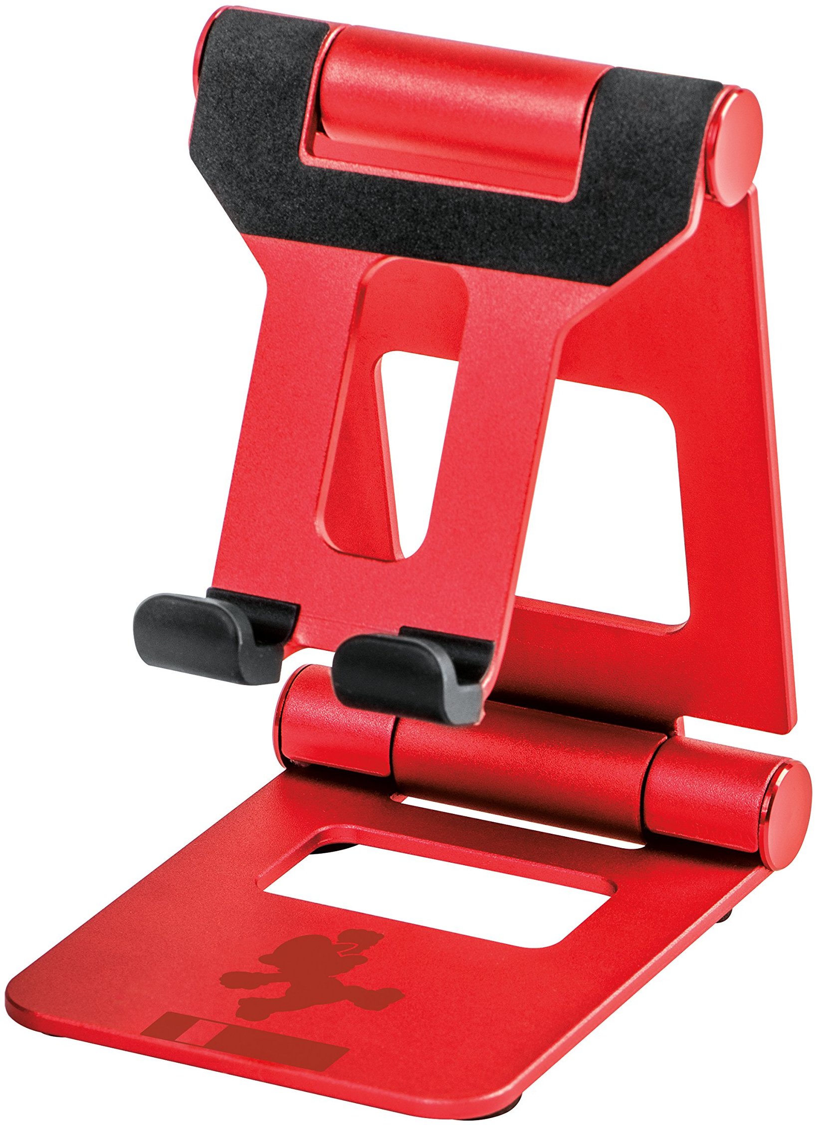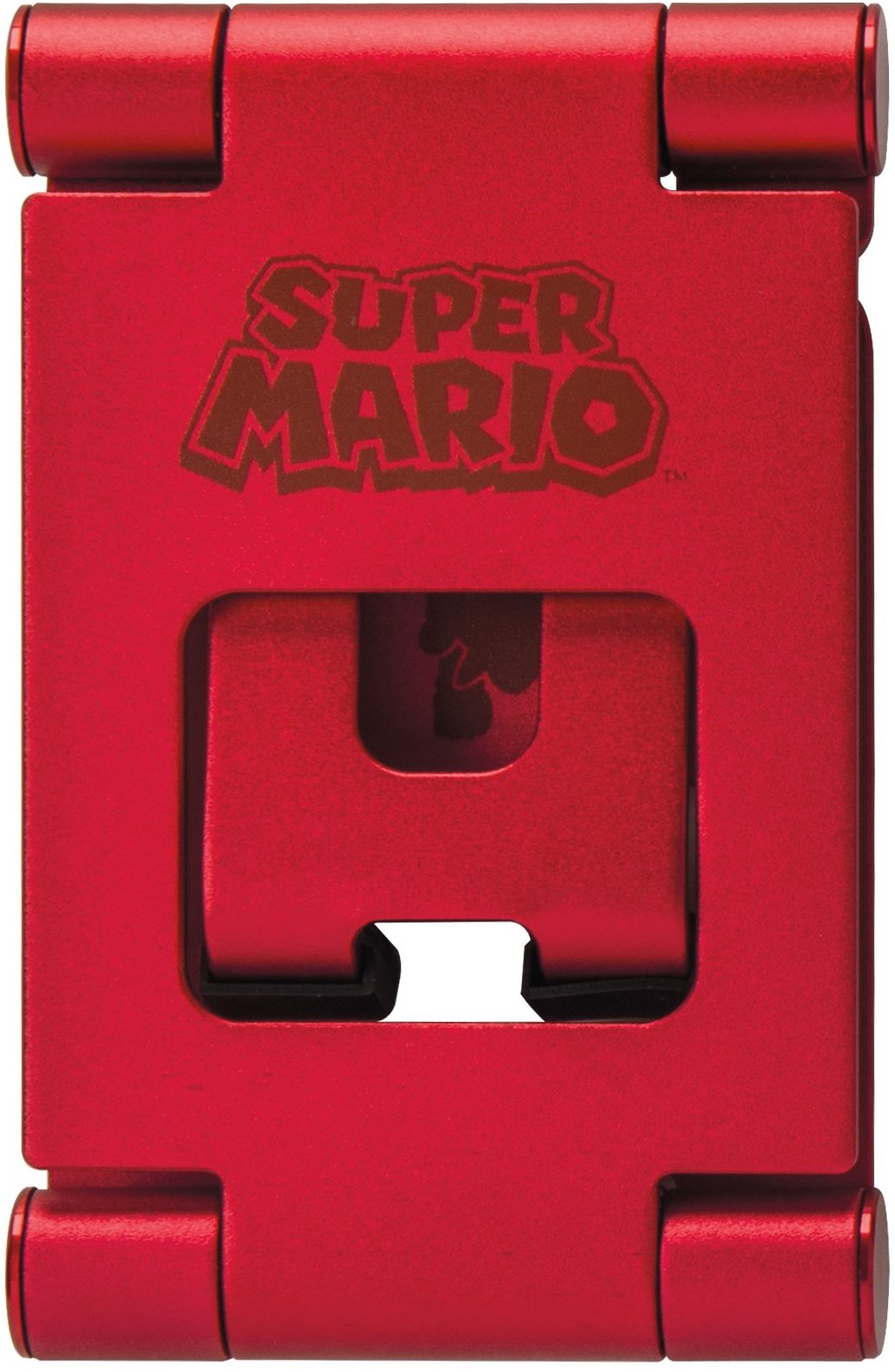 Officially licensed by Nintendo, the “Super Mario” / “Zelda: Breath of the Wild” Compact Metal Stand is designed to hold the Nintendo Switch so you can play and charge at home or on-the-go. Made of durable aluminum alloy, this stand features 2-point articulation for adjustable viewing angles. Anti-slip rubber pads keep the Nintendo Switch in place and prevent the stand from sliding. Its fold-away design fits right in your pocket or in the included drawstring travel bag. Take this stand anywhere to play in tabletop mode.