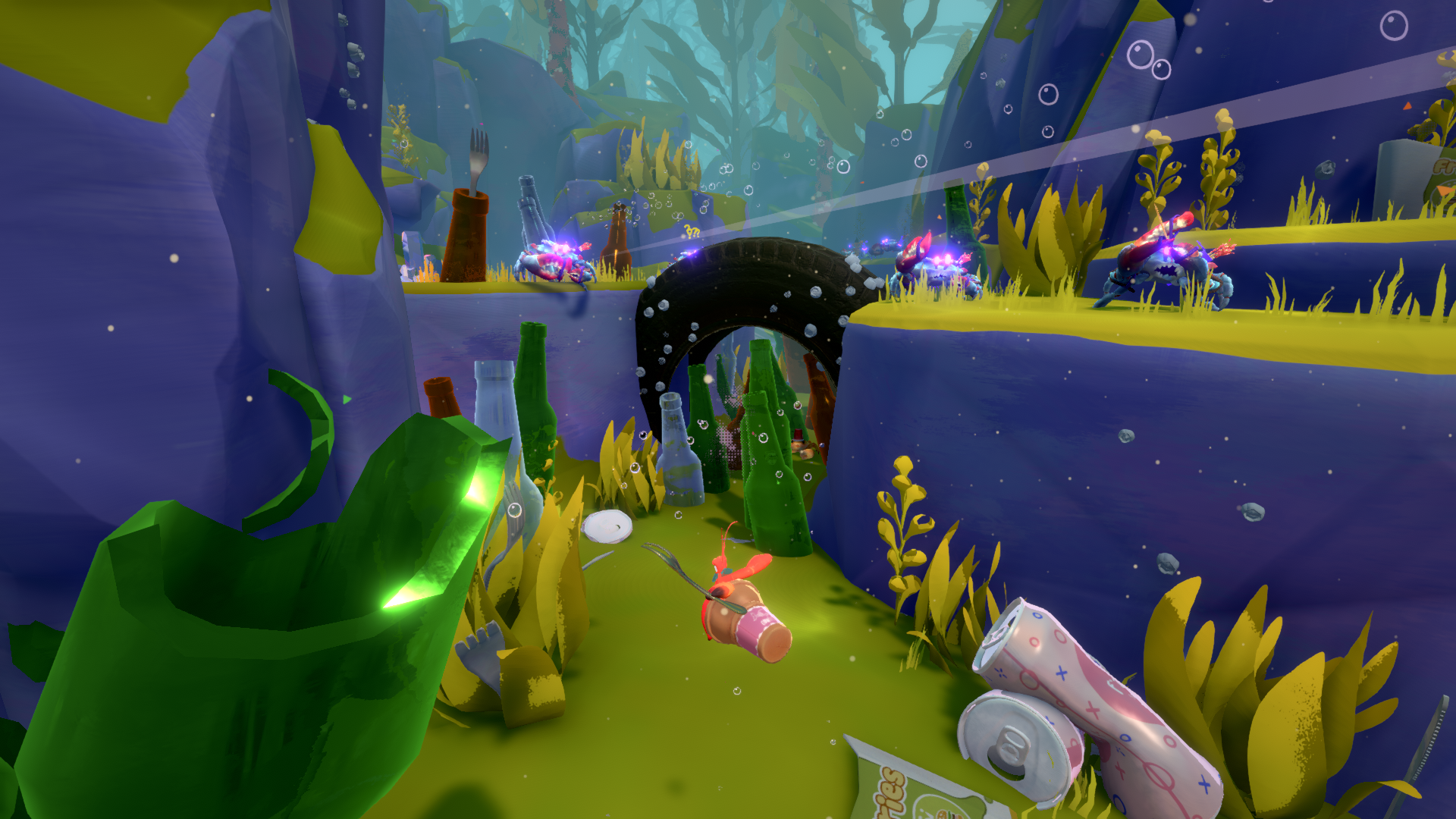 The game is also a bit of a platformer, too. As you make your way to the next boss battle, not only will you be jumping around and riding moving platforms but using a grapple hook to zip between far-off landings. The physics of the platforming feel floaty, as you would expect from an underwater environment, and I found that my jumps needed to be very precise to avoid falling to my doom in the cavernous depths below. You’ll encounter smaller foes around the world as you explore, but you don’t necessarily need to fight all of them if you don’t want to – in fact, if you have a shell equipped you really want to save for an upcoming boss, it may actually be wise to avoid some battles here and there (especially if you’re a wimp like me).