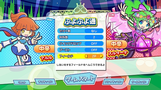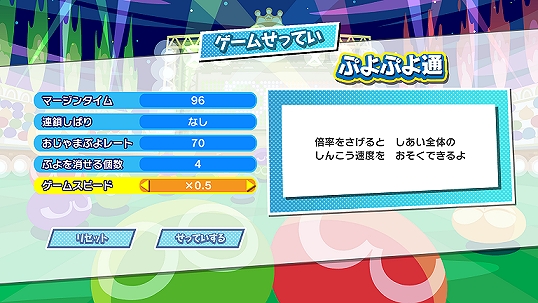 Adjust the game speed between three settings—“x1.0 (normal setting),” “x0.7,” and “x0.5.” Changing this setting does not affect how a match starts and ends, the fall speed of Nuisance Puyo, or Quick Drop time.