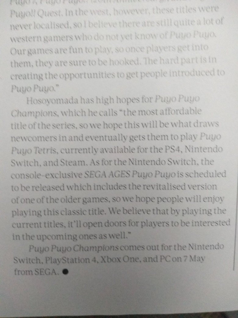 In the latest issue of Neo Magazine, a Puyo Puyo feature is apparently included. It includes commentary from director Mizuki Hosoyamada and the reveal that Puyo Puyo eSports is heading west. The game will be released as the previously-rumored Puyo Puyo Champions.
