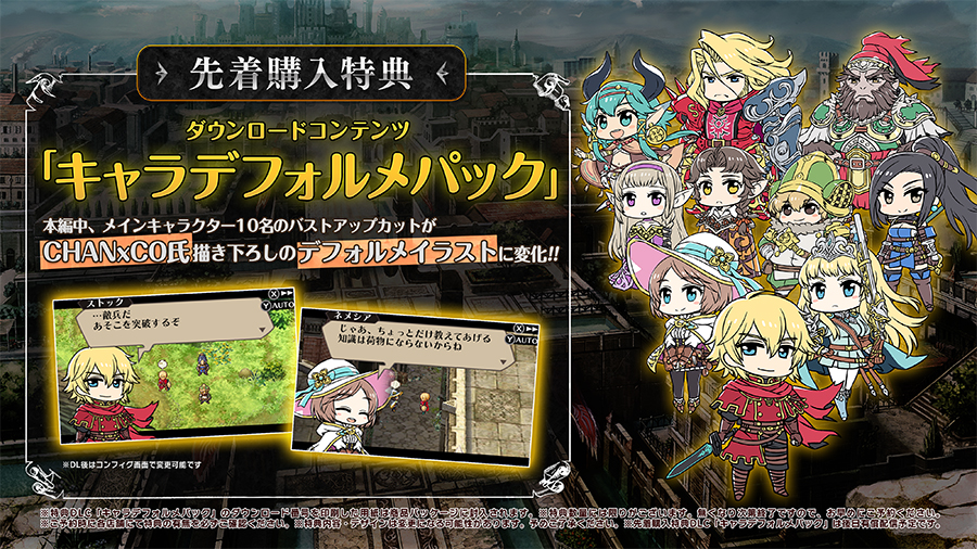 Finally, some information on the game’s retail release in Japan. First-print copies will come with a download code for the “Character Deformation Pack”, which changes the portraits of the ten main characters into chibi illustrations drawn by CHANxCO. There will also be a special edition of the game called “Perfect Edition”. For 9800, you will get a copy of the game, special boxart, the complete soundtrack of the game on two CDs, a 100-page full color art book and download codes for four event scenes and the ability to change the characters’ portraits to the ones from the original DS version.