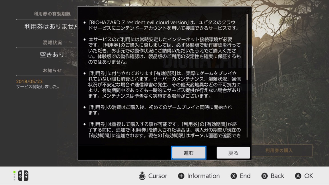 Resident Evil 7 Cloud Version can be played for free for 15 minutes. After that, a 180-day play session can be purchased for 2,000 yen.