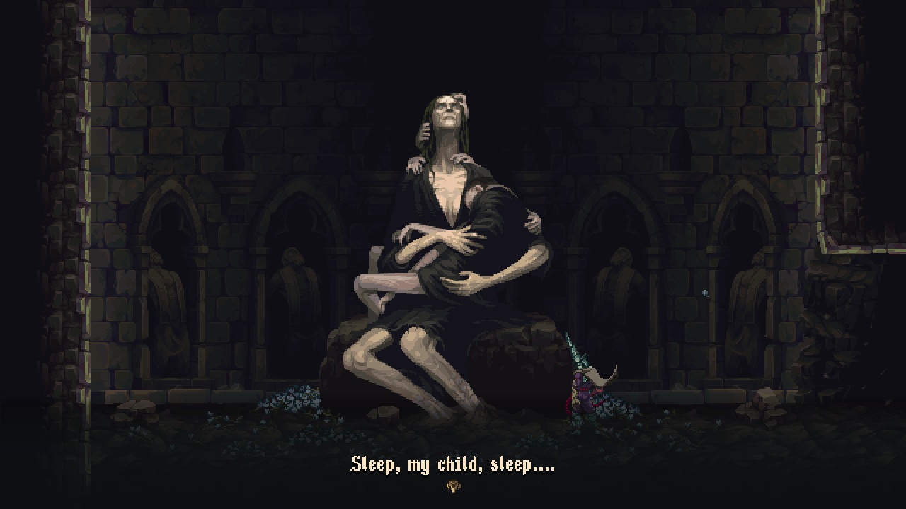 Blasphemous II has an excellent world design and artistic direction, steeped heavily in religious imagery, and the pixel art conveys a high level of detail and animation, with some truly disturbing bosses and NPCs being particular highlights. Cutscenes have received a noticeable upgrade and I would have liked to have seen more of these in the game, as they are unfortunately very scarce and generally reserved only for major story moments. The ambient soundtrack is mostly unobtrusive but each area has its own distinct theme that helps to generate a unique atmosphere, and what little voice acting there is is of a good quality. I found myself paying more attention to the sound effects than I did the soundtrack, with meaty hits from the Veredicto being especially satisfying, as well as the echoing clash of steel from a successfully executed parry, giving an added level of feedback that made using these weapons in combat more satisfying than they otherwise might have been.