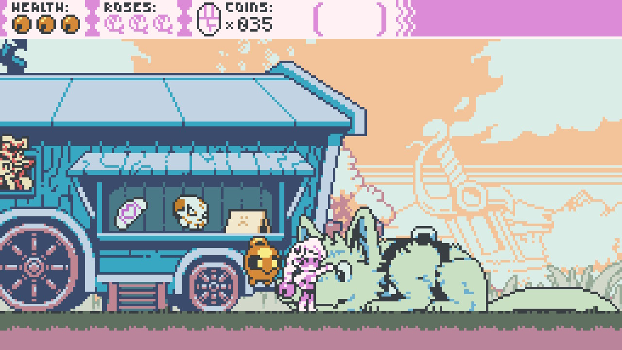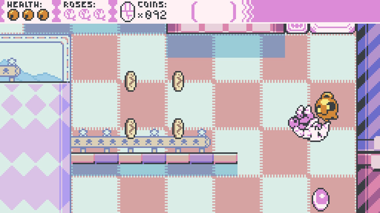 Aesthetically, Curse Crackers seems to be somewhere between the Game Boy Color and Game Boy Advance in terms of design. Each character is minimalistic and seems to have a monochromatic theme, as do enemies and items you’ll encounter in your travels. Levels are fairly big, and thankfully if you miss something like a rose or other collectible the first run, you’re able to easily pop back in and grab the item and leave the level without being penalized for not completing it, saving a lot of time for those who feel like grabbing everything for a 100% completion run. After a while, enemies all seem to be the same little skeleton guys over and over, but with them being easy to dispatch and numerous, I found myself comparing them to Mario’s many Goombas – just little annoying guys that could be taken out with ease. A little road bump, if you will.