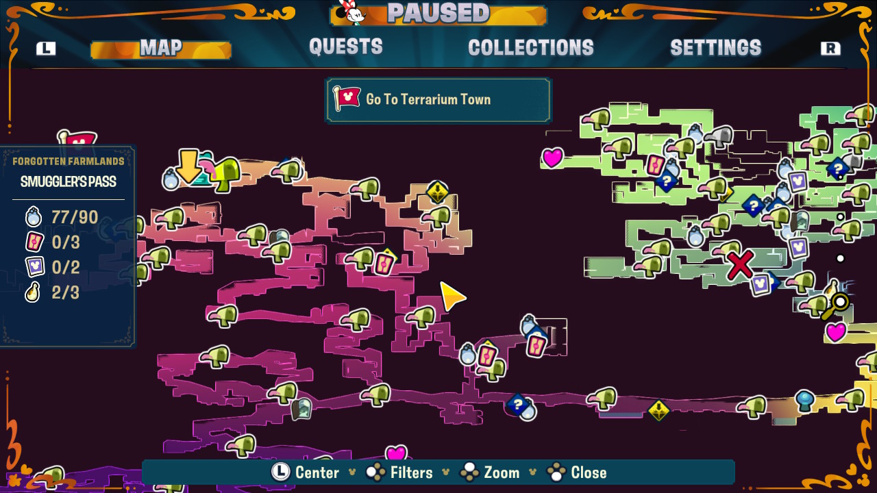 With traversal being such a huge focus of Disney Illusion Island, it’s very fortunate that moving around Monoth feels excellent. I’d say it feels remarkably close to something like Rayman Legends in terms of physics – characters are light on their feet, agile in the air, and snappy when hurdling up ledges. The map is massive, with plenty of tucked-away rooms containing collectibles to try and reach, of which my favorites are memorabilia inspired by classic Mickey cartoons. There are also Hidden Mickeys tucked cleverly into the background that players can seek out if they wish, and it’s quite satisfying stumbling across one in an unexpected place. For completionists, checkpoints are densely placed across Monoth; toward the end of the game, it becomes possible to fast travel to any of them, making mopping up those unfinished chunks of the map a breeze.