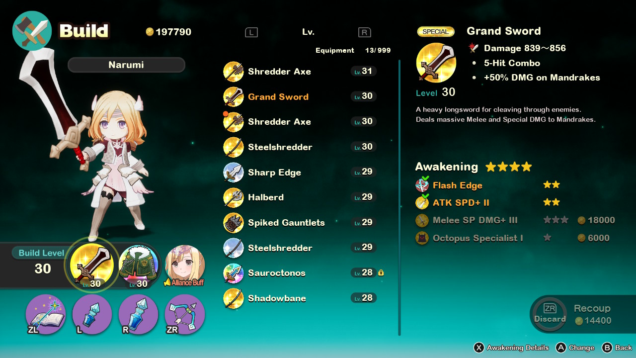 As you progress through the dungeon you will acquire a lot of equipment, with the usual mix of weapons that come with various different strengths and drawbacks: for example, Katana hit much harder than Fists, but are notably slower and have fewer hits per combo. Weapons come in four tiers of rarity, and can be upgraded further with Awakening skills, which grant them additional bonuses for the price of a bit of gold and a few slots, with the number of slots a skill takes up being determined by its strength. What Awakening skills are available to a weapon is entirely random, and you’ll need to choose wisely what you want to unlock, as there is no way to undo the choice once it is made and weapons do not have enough space for every skill they can acquire.