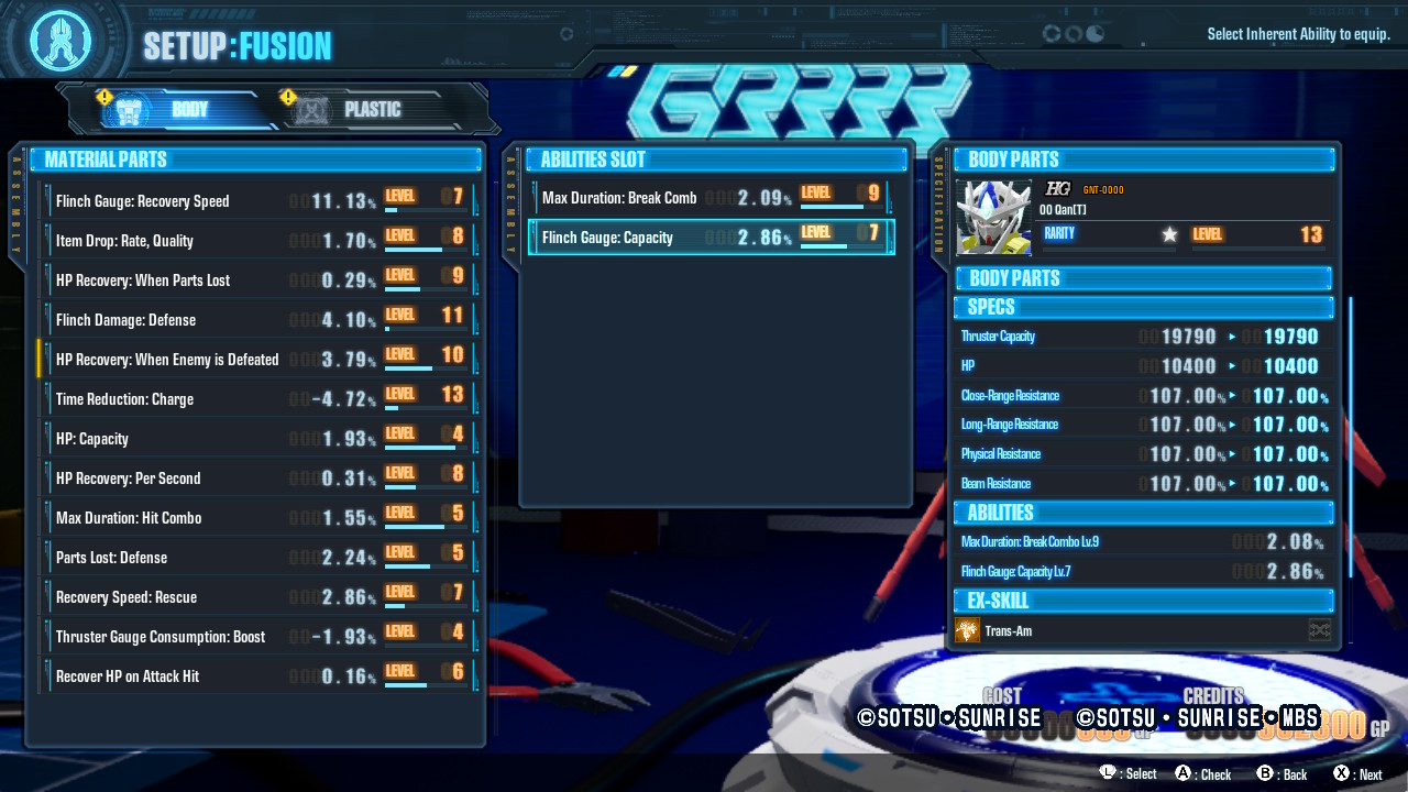 However, this is the tip of the iceberg. Constructing a Gunpla can be a very involved process if you choose as there are an almost obscene number of parameters to consider when creating the perfect fighting machine. As well as Specs, parts also have Abilities, and these vary considerably depending on what the Gunpla it originated from is best suited for. The percentage differences are often small, but they add up over time and allow for some highly specialized builds if you play into them. Some parts will also have unique Extra Abilities for additional combat skills. You can also equip eight optional Builders Parts for additional EX-Skills and OP–Skills, broadening your available movepool in combat quite substantially.