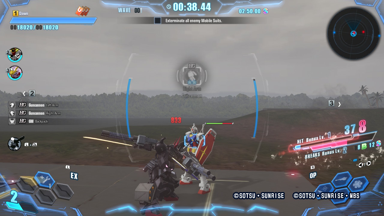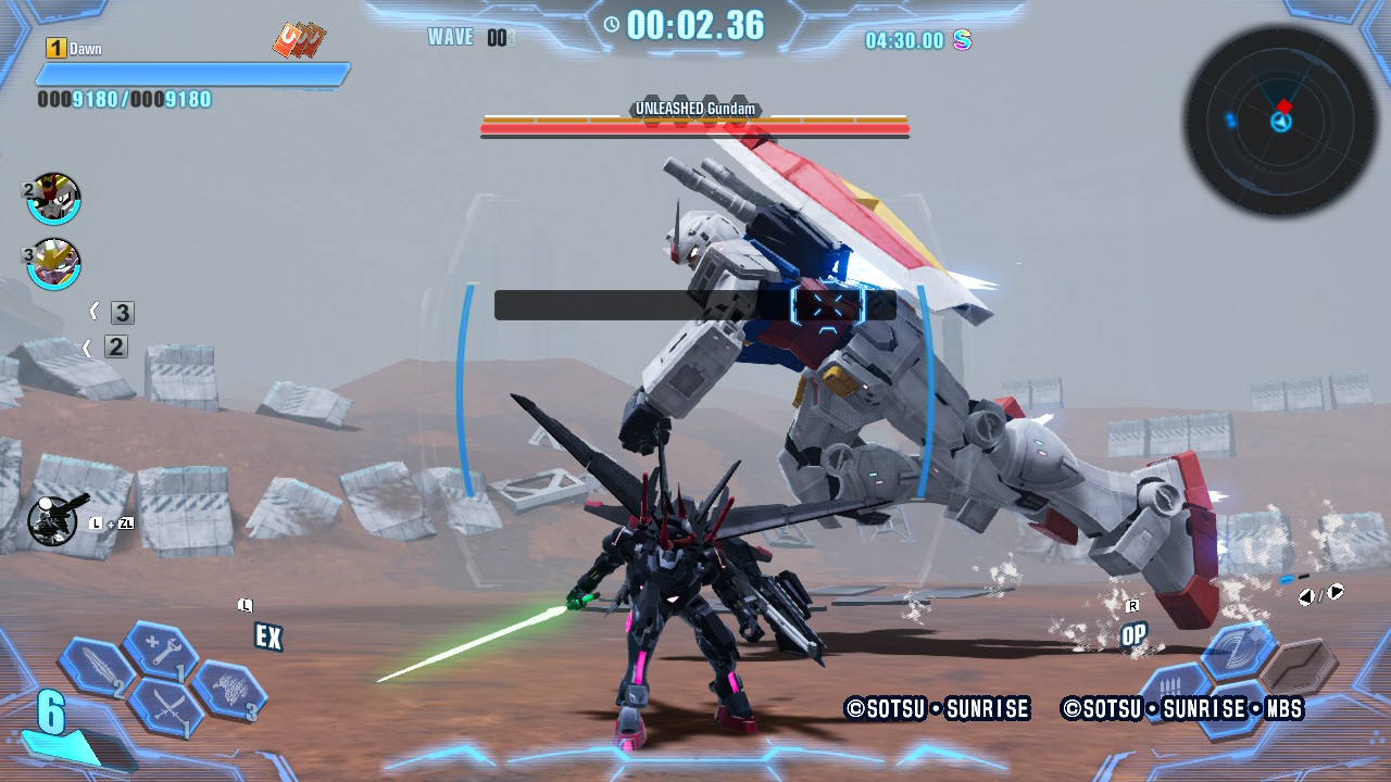 Combat is generally fast and frantic, with bosses being intelligent enough to block, dodge, and use their own skills, and although AI-controlled party members are largely useless on Standard and Hardcore difficulties against anything other than weaker mobs, they are at least able to keep the rank and file at bay whilst you focus on other enemies. Most Gunpla control quite smoothly, although I found that the control scheme felt far too busy and very unwieldy at times, with jump and dash being assigned to the same button and being dependent on how long you hold that button down (this is especially problematic when you need to hit airborne enemies or the top part of giant bosses) and melee attacks having both short and long presses. The lock-on can also be extremely uncooperative when enemies are clustered together, which happens often, and sometimes you can be flailing wildly whilst you reorient yourself and establish your target. When you’re racing against the timer to get the best possible score, or find yourself surrounded by stronger enemies whose attacks you’ll need to avoid, it can be quite difficult to get your unit to do exactly what you want it to. On Casual difficulty the game is perhaps a little too unengaging as well, as enemies will mill around aimlessly as they wait for you to carve them up. However, this does allow you to acquire parts to tackle higher difficulties if you’re struggling, making it a good accessibility option for those who need it.