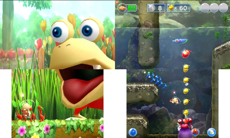 While the difficulty may not challenge most players, there is some joy that comes with exploring each sector’s various levels. To lend to the 3DS’ lack of power, Hey! Pikmin forgoes the photo-realistic style of the series’ past and instead chooses a more whimsical and almost painting-like art style. Unfortunately, the game ends up looking a bit blown out on the 3DS, with many background textures looking flat and stretched. Another pretty large detractor from the games style is its frame rate. Pikmin is a series known for having a lot of models on screen at once, with each Pikmin being its own model that acts independently from the rest. Unsurprisingly, this doesn’t work very well on the 3DS. When Olimar carries anywhere between 8-20 Pikmin, the framerate drops very noticeably. While it doesn’t make the game unplayable, it certainly does not help the presentation or gameplay. The problem is very slightly alleviated on the New 3DS models, but not enough to fix the issue entirely.