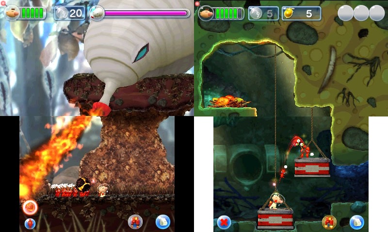 For the first time in the series, Hey! Pikmin introduces 2D side-scrolling gameplay. Players control Olimar using the circle pad, and can throw Pikmin by tapping the touch screen. Olimar also has a new addition to his arsenal: a jetpack that allows him to hover off the ground for a short time to allow him to cross gaps and reach higher places. The addition of the jetpack lends itself to a bit more varied level design, allowing for more verticality and added obstacles. The game is split up into sectors, and each one has about six or seven levels within, some only accessible by finding hidden exits or meeting certain requirements. Each level ends up adding some sort of new concept that sets levels apart from each other; whether it be lighting up dark caves with yellow Pikmin, swimming through levels with blue Pikmin, or hovering up tree branches using the jetpack. However, the level design as a whole ends up feeling fairly simplistic as the game goes on. Finding various caves that lead to new portions of the level, collecting plant pot fragments to make bridges, and climbing vines are common occurrences throughout most levels and ends up leaving behind a sense of repetitiveness. Along with the more simplistic level design, the difficulty of Hey! Pikmin in terms of puzzle solving is fairly low. Puzzles are more often than not very obvious and don’t take more than a few seconds to figure out. It’s a shame, as the main series games’ ability to make players think and plan strategies enhanced the appeal of the series tenfold; which makes Hey! Pikmin feel quite shallow in comparison.