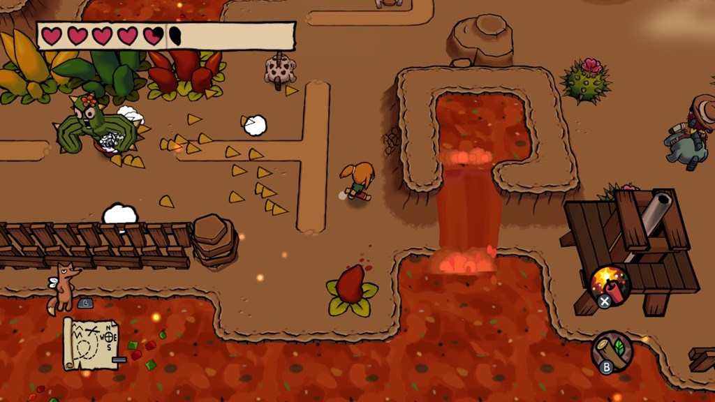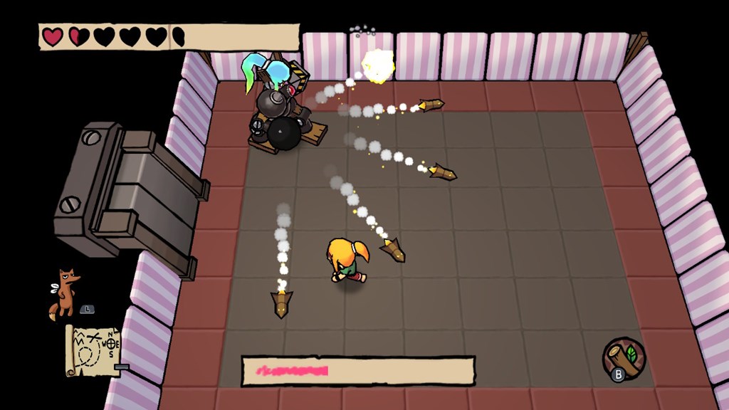 Ittle Dew 2+ has you start out with five hearts and goes down in a forgivable manner as you get hit, and while you could easily go through the whole game this way, you can find boxes of crayons scattered throughout that will add a quarter of a heart to your overall health. You can get up to an additional five hearts for a total of ten hearts, making for a higher chance at surviving fights or reasonable risk-taking when you want to just hack-and-slash away at a boss when they’re so close to dying without having to constantly dodge and run around a room, should the environment allow you to do so (for example, some enemies and bosses have a massive knockback attack, and a good amount of dungeons have sections that have small tiles for you to go across or fight on or else you’ll find yourself constantly falling down and having to start the room/puzzle/fight all over again).
