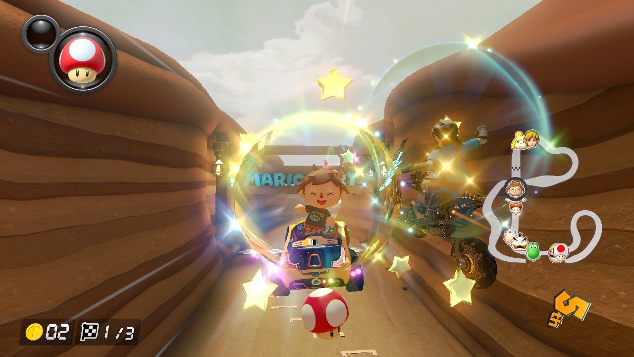 It’s worth noting that while some of these course have had some tweaks to their design to help them fit in a bit better with Mario Kart 8 Deluxe’s base courses – Coconut Mall, for example, has a glider segment added where there was originally just a jump to the ground – these tracks are devoid of the anti-gravity segments that were a huge part of the marketing build-up for MK8D. I noticed their absence, but I still wouldn’t say the courses feel like they are harmed by it, especially because many of these courses are awash with branching paths and shortcuts that add an extra layer of replayability and complexity to them.