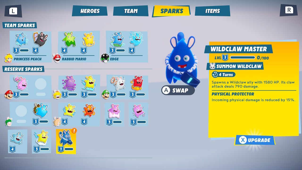 It helps that you have an opportunity to optimize your party and Sparks before each battle. Clicking in the left analog stick lets you use Beep-O – the returning flying Roomba from the first game – to survey over the battlefield and let you scout enemy placements and abilities. Party member selection is also important, as certain heroes are going to be more useful in some situations than others. Luigi, for example, is best when dealing with long-range enemies thanks to his sniper rifle (I’m not kidding) whereas Peach’s Boom-Brella is great for dealing a wide spread of damage to clusters of foes. You’ll also want to consider Special Abilities when building a party – Rabbid Peach, for example, is the only character who can heal other teammates. Each of your party members has their own individual Skill Tree that will let players further upgrade their abilities as the party collectively levels up, and delightfully, you can reallocate spent skill points at any time to experiment with different character builds.