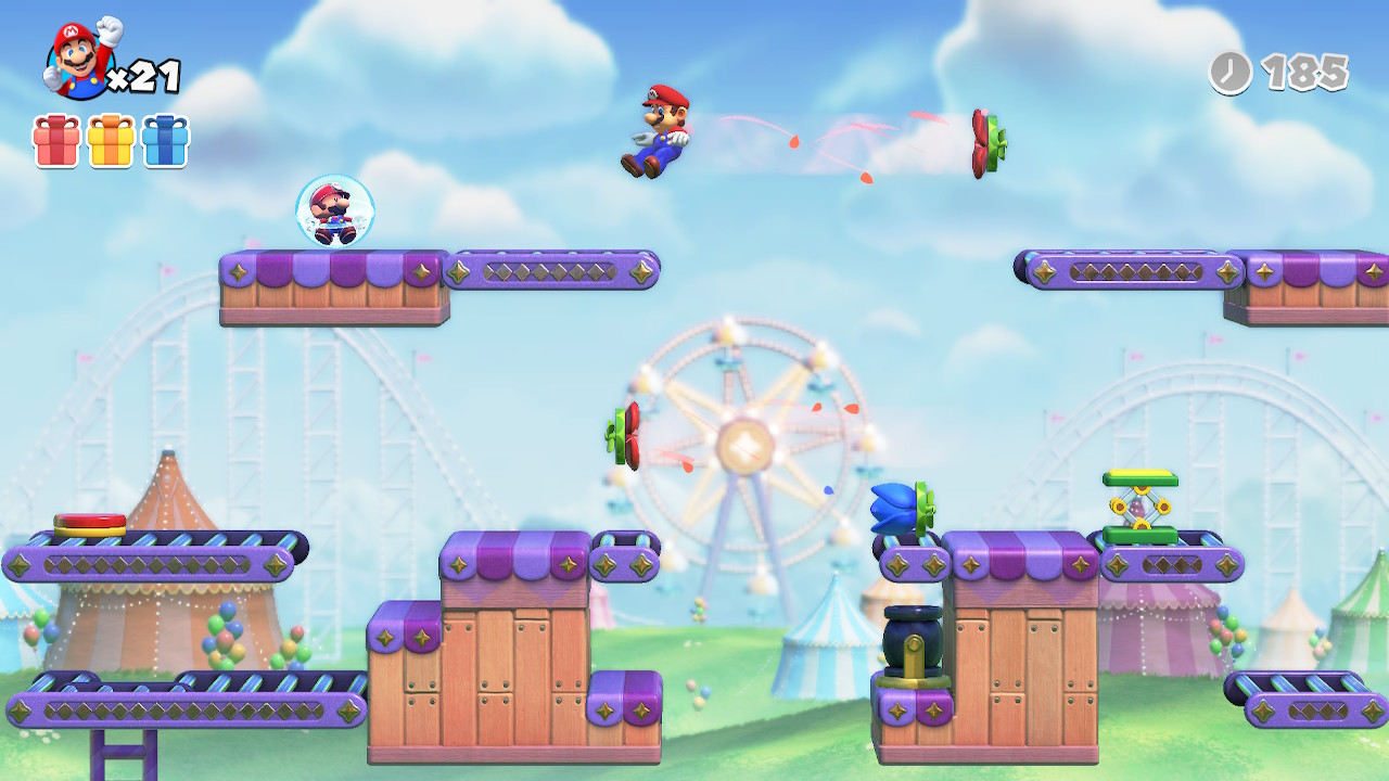 Beyond collecting keys and toys, each world in the main campaign also has a stage in which Mario must guide the six Mini-Marios safely to the exit, helping them avoid hazards. These levels are a great change of pace, and there’s incentive to do them well, because each Mini-Mario that survives will let Mario take an extra hit of damage in the next level: a boss battle against Donkey Kong. I had a blast with these too, as they combine some of the mechanics from each world with gameplay that’s a bit more reflex-based; with each hit DK takes, his attacks get faster. It also never gets old to pick up a barrel or bomb and try and nail a well-timed toss at DK, only to see him get all annoyed when you manage to do so. The music during these sequences is great too, mixing some familiar Donkey Kong sounds with the excellent jazzy bops that accentuate the action.