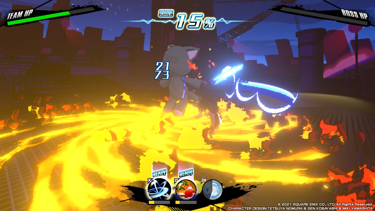 NEO does a great job at separating control between characters in battle. Each character can be equipped with a Pin for the fight, which gets assigned to an action button. In combat, by pressing the assigned button for each character you can switch between them fluidly and chain attacks. Chaining attacks becomes very important for raising the Groove meter, which at 100% allows the player to unleash a party move that can increase the damage done to enemy Noise as well as provide an area of affect with extra elemental damage. The elemental damage specified with this party move is based on the elements equipped by the team, so with fire damage you can unleash a massive fireball and with electric, pillars of energy will explode around you. Taking advantage of elemental weaknesses can see a massive increase in damage, cutting down the amount of time in a fight and helping to earn a higher rank with more rewards.