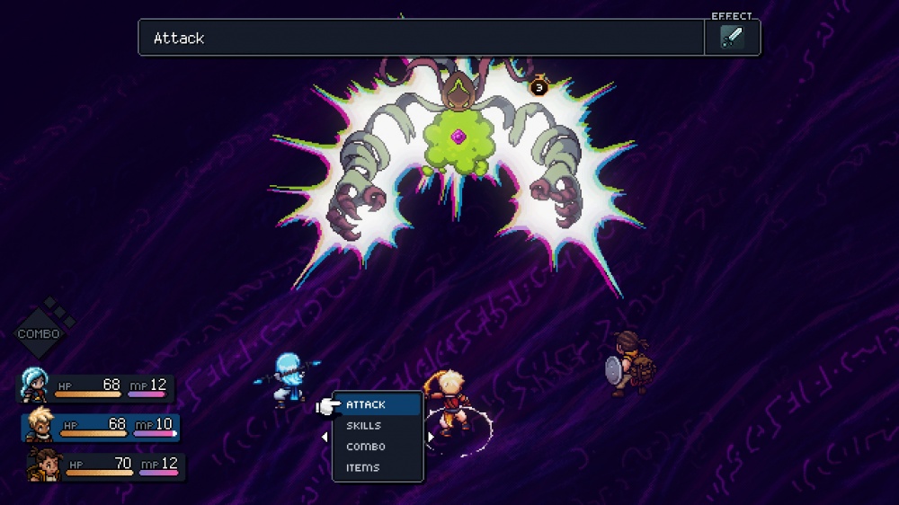 Combat in Sea of Stars is not unlike popular turn-based games like Dragon Quest – select a party member and you’ll be given a menu in which to choose commands. Regular melee attacks, character-specific skills, and items can be selected and used. Zale and Valere have a couple of different effects to use wisely in each skirmish: weapon type and magic type. With Zale using slashing weapons, enemies with that icon over their heads in a fight can be interrupted if struck the appropriate amount of times before their turn arrives in battle. These icons correspond to other types of weapons along with sun or moon magic damage as well, and enemies can have multiple icons that will need to be struck in order to interrupt the queued ability. Failure to meet each icon with its opposing force will usually result in a move that does massive damage to one or more party members, making it a good idea to try and interrupt them whenever possible.